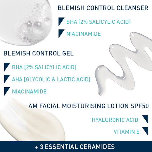 Take control of your blemish-prone skin from AM to PM with CeraVe Blemish Control Essentials, which includes the Blemish Control Cleanser, Blemish Control Gel & AM Facial Moisturising Lotion SPF50.