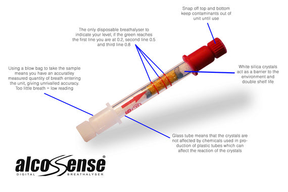 AlcoSense Single Use Breathalysers are the only single use breathalyser to not just tell you that you have alcohol in your system, but to also accurately indicate how much. Three rings around the tube represent the three common limits in the UK and Europe; 0.2‰BAC for the Irish Professional Driver Limit and Eastern Europe, 0.5‰BAC for the Scottish, Irish and Continental European Limit and 0.8‰BAC for the English and Welsh Limits.