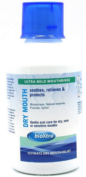 bioXtra mouth rinse is an alcohol free mouthwash that is gentle on sensitive and irritated gums. The gentle oral rinse comfortably glides through your mouth and provides you with protection against gum disease, plaque build up and prevent cavities from developing.