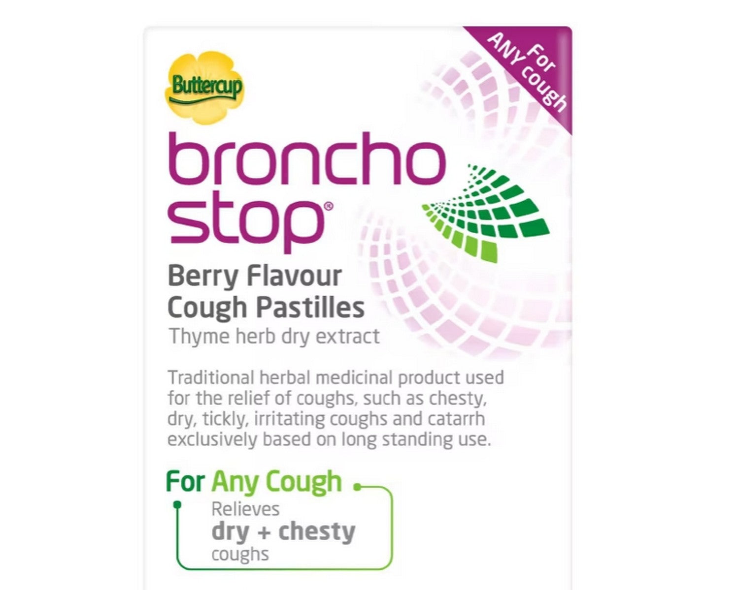 BronchoStop Cough Pastilles are berry-flavoured pastilles that provide relief from irritating dry and chesty coughs.