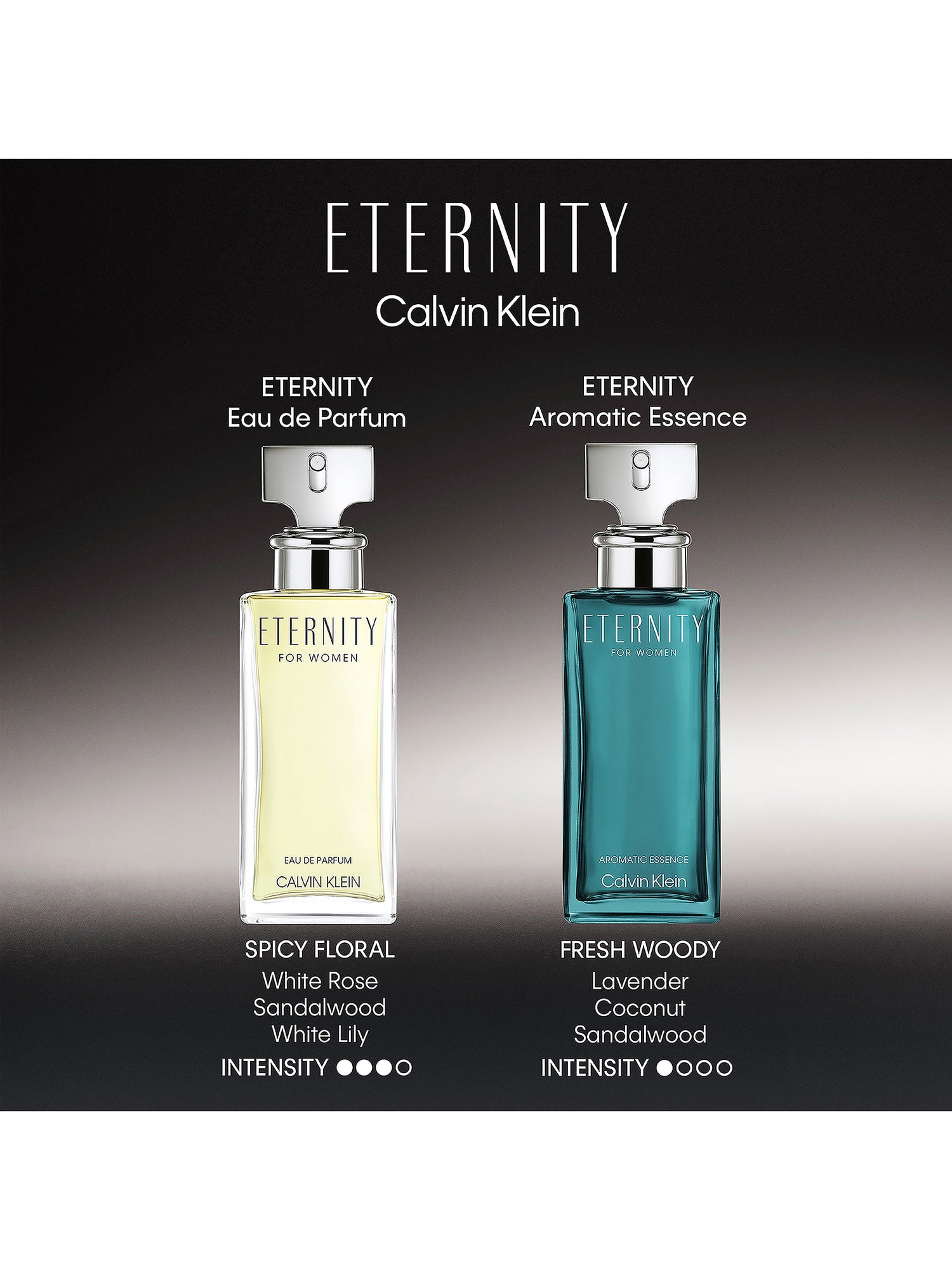 Housed in a lacquered teal green glass bottle, the fragrance’s flacon is inspired by the beauty of natural gemstones. The perfume maintains the shape and silver cap of the iconic original Eternity fragrances.