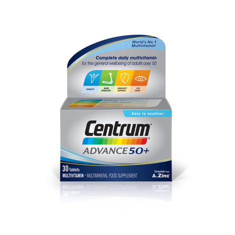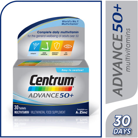 Age may just be a number but it can impact your nutritional needs. That's why Centrum Advance 50+ multivitamin has adjusted levels of key nutrients to offer specific nutritional support to adults over 50 to support your energy levels and help you keep up with your busy life. Vitamin B12 contributes to normal energy yielding metabolism, Vitamin C helps maintain the normal functioning of the immune system and Vitamin D helps maintain normal bones and teeth. You can trust Centrum Advance 50+ to supplement your diet, to help fulfil the nutritional needs of men and women over the age of 50.
