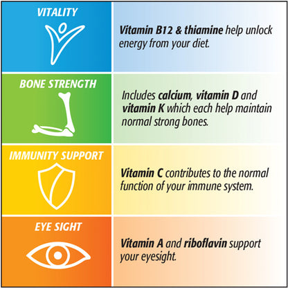 Calcium Salts Of Orthophosphoric Acid (Dicalcium Phosphate); Magnesium Oxide; L-Ascorbic Acid; Bulking Agents: E 460, E 464, E 1200; Potassium Chloride; Dl-Alpha Tocopheryl Acetate; Stabiliser: E 1202; Nicotinamide; Calcium D-Pantothenate; Ferrous Fumarate; Zinc Oxide; Manganese Sulphate; Emulsifier: E 470B; Anticaking Agents: E 551, E 553B; Beta-Carotene; Pyridoxine Hydrochloride; Thiamin Mononitrate; Riboflavin; Gelatine; Vegetable Oil (Coconut and Palm Kernel); Cupric Sulphate; Retinyl Acetate; Pteroylmonoglutamic Acid; Chromium (III) Chloride; Sodium Molybdate; Potassium Iodide; D-Biotin; Sodium Selenate; Phylloquinone; Antioxidant: E 321; Cholecalciferol; Cyanocobalamin; Colours: E 171, E 153. Formulations may change from time to time. Please always check the packaging before use.