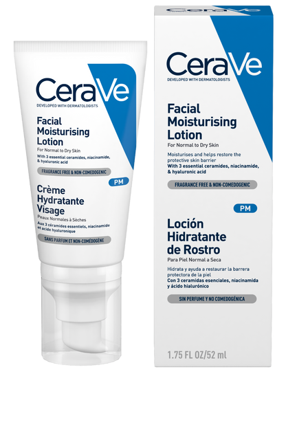 CeraVe PM Facial Moisturising Lotion is a lightweight fast-absorbing lotion for evening use. Enriched with 3 Essential Ceramides, Hyaluronic Acid and Niacinamide, this lotion provides skin barrier protection as well as instant & long-lasting hydration. Leaves skin feeling hydrated and nourished.