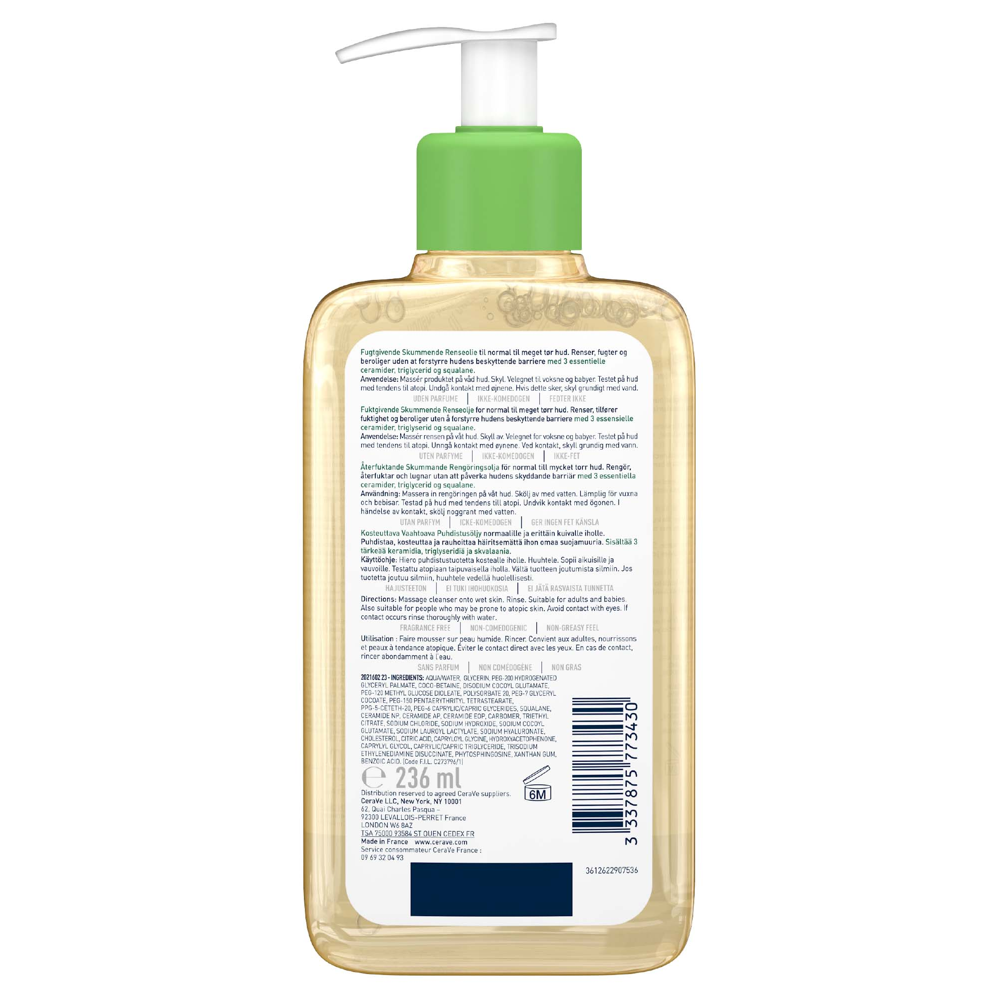 Unique foaming oil daily cleanser to efficiently cleanse, while providing a nourishing comfort that leaves face & body skin looking healthy. Filled with hydration boosting ingredients; 3 Essential Ceramides, Glycerin, Hyaluronic Acid, Squalane & Triglyceride, this cleanser removes dirt while maintaining the skin's protective barrier. Developed with dermatologists, CeraVe Hydrating Foaming Oil Cleanser is suitable for normal to very dry skin. Also suitable for sensitive skin, baby skin (3+ months) & atopic-prone skin.