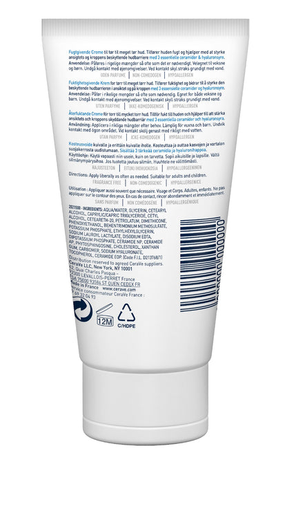 A rich cream moisturiser for face & body that delivers instant & long-lasting hydration, for up to 24 hours. For dry to very dry skin. Also suitable for eczema-prone skin. Enriched with Hyaluronic Acid, 3 Essential Ceramides, and formulated with CeraVe's patented MVE® delivery technology, this cream hydrates & helps protect the skin's natural barrier.