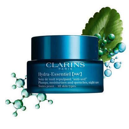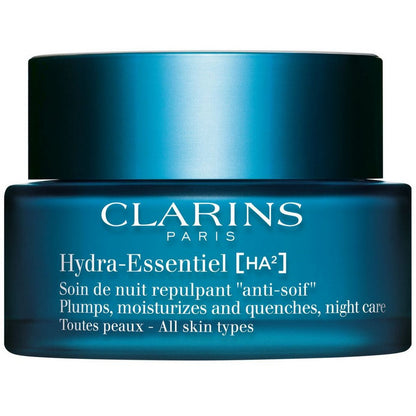 The Clarins Hydra-Essentiel Night Cream is enriched with hyaluronic acid and organic leaf of life extract intensely hydrates and plumps the skin. At the heart of its formula, the Hyaluronic Power Complex developed by Clarins Laboratories helps boost the skin's natural self-hydration mechanisms and preserve its moisture reserves. Since the skin's barrier function is less effective and water evaporates more easily at night, the cream also contains plant-based squalane, which reinforces the hydrolipidic film, and line-filling pearls to visibly smooth dehydration wrinkles. Its airy, creamy texture melts instantly into the skin, leaving it radiant when you wake up.