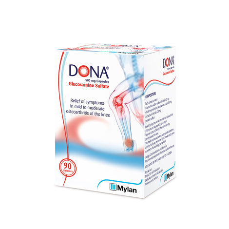 Dona contains Glucosamine Sulphate which belongs to a group of medicines called non-steroidal anti inflammatory and anti-rheumatic agents. One capsule contains 50mg Sodium. To be taken into consideration by patients on a controlled sodium diet. Dona is a hard red capsule contained in a polyethylene bottle with a snap on neck provided with a cap and a removable security closure system.