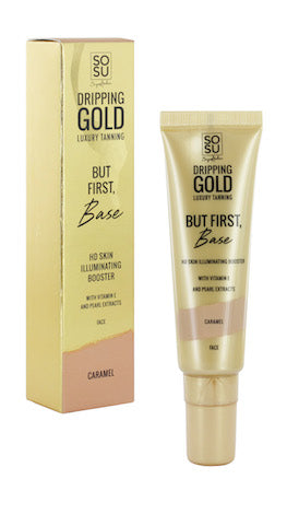 SOSU by Suzanne Jackson Dripping Gold But First, Base - Caramel is an illuminating lightweight gel created to leave the skin glowing. It creates the perfect soft-focus, smooth boost to your base. The lightweight makeup-skincare hybrid formula is packed full of mother of pearl particles that create an illuminating, glowing skin effect.