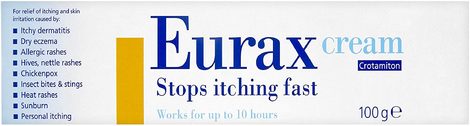 Eurax cream, for the relief of itching and skin irritation. For the relief of itching and skin irritation caused by itchy dermatitis, dry eczema, allergic rashes, hives, nettle rashes, chicken pox, insect bites and stings, heat rashes, sunburn and personal itching.