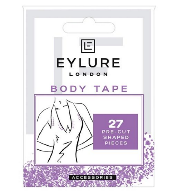 Body Tape, which comes in double-sided, pre-cut strips, securely fastens clothing to your body to avoid gaping and embarrassment.