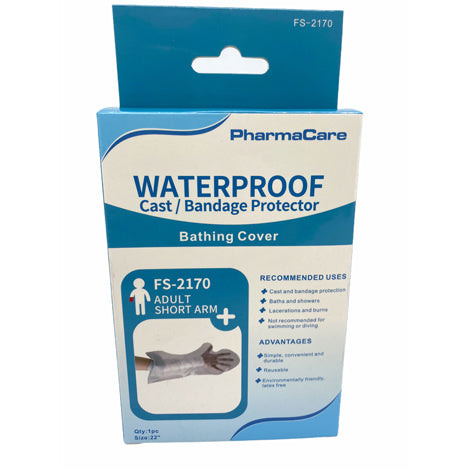 Bathing Waterproof Cast Cover Adult Short Arm is used to protect casts and bandages from any damage, including when the patient is in the bath or shower, and is also ideal for protecting lacerations and burns. The cast cover is also environmentally friendly and is Latex free. Uses The Pharmacare Cast & Bandage Protector is used to protect casts and bandages on the arm from any damage, including when the patient is in the bath or shower. It is ideal for protecting lacerations and burns. Application Remove the Pharmacare Waterproof Cast & Bandage Protector from the box Stretch the silicone hole to facilitate arm entry Carefully insert the cast or bandaged part of the arm into the cast / bandage protector Completely cover the cast or bandage Ensure the silicone hole is properly sealed to the skin and straighten out the silicone film