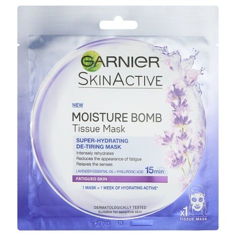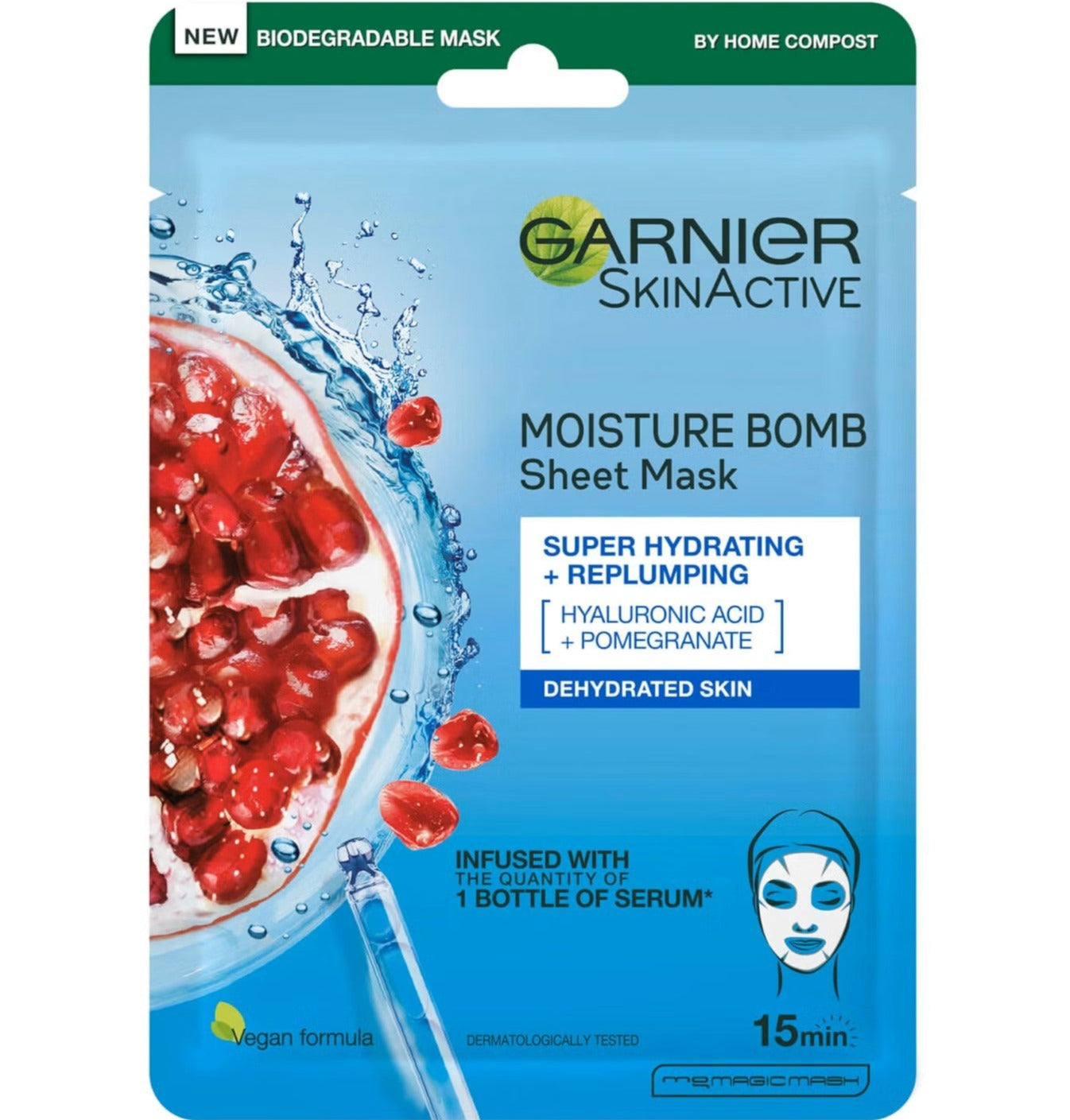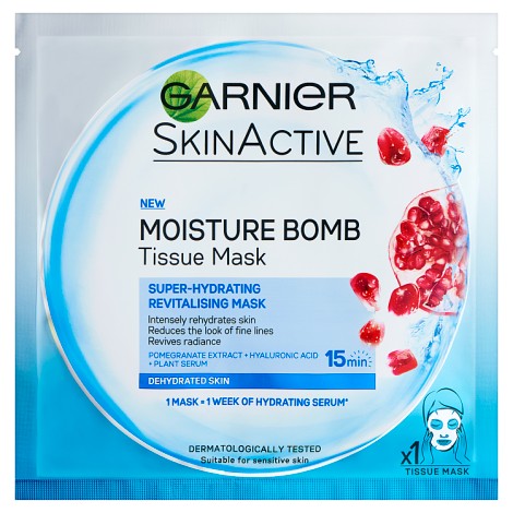 The Garnier Moisture Bomb Tissue Mask has been specially enriched with hyaluronic acid, plant serum & refreshing pomegranate. These hydrating ingredients nourish the skin & reduce the appearance of fine lines.