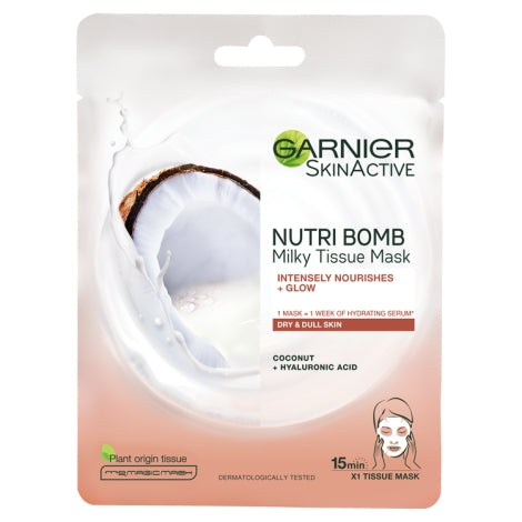 Garnier Nutri Bomb Coconut hydrating glow enhancing milky sheet mask for dry and dull skin. Plump skin with moisture, intensely nourish and revive radiance for skin that glows! With a vegan* formula, these face tissue masks are created with ultra-thin tissue & infused with 1 week's worth of hydrating serum**.