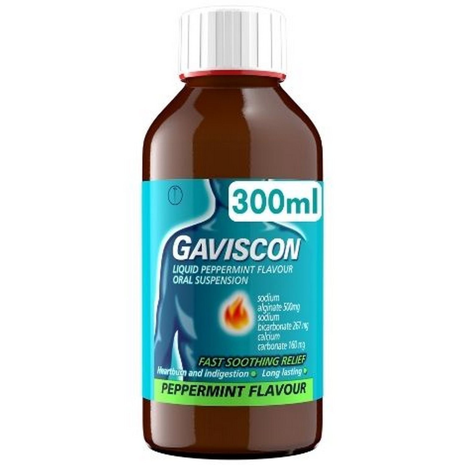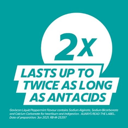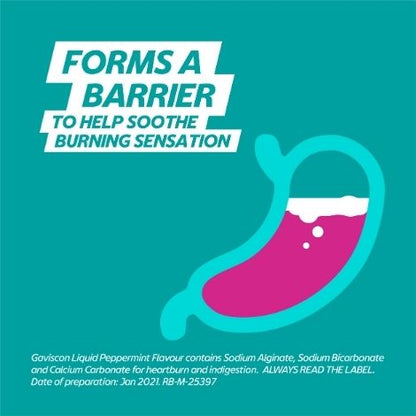 Gaviscon Liquid Peppermint flavour oral suspension provides fast soothing relief against heartburn and indigestion.