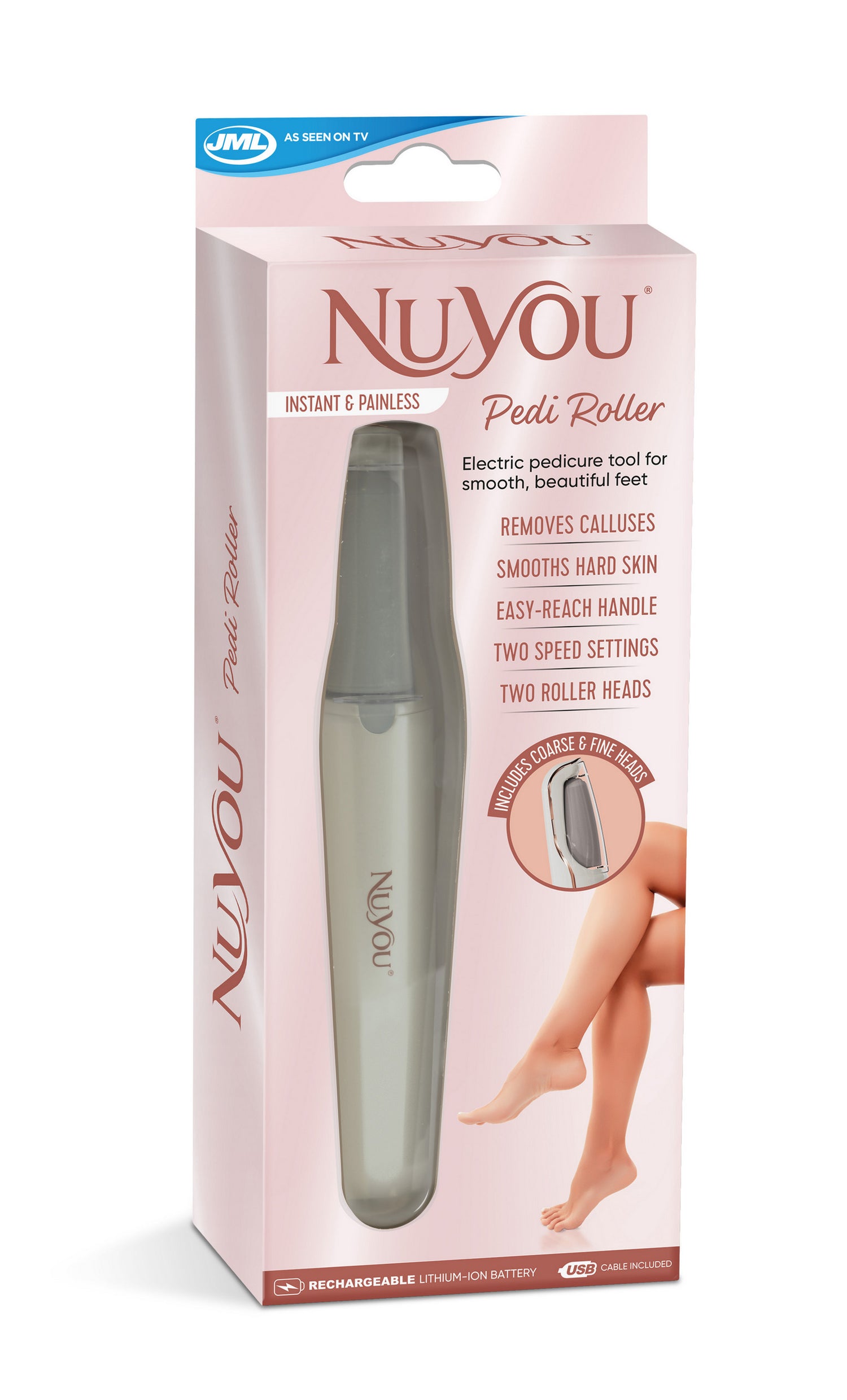 NuYou Pedi Roller is an at-home pedicure tool, so you can have smooth, more youthful-looking feet from the comfort of your own home. With its easy-reach design, you can reach around your heels, toes, sides, and balls of your feet. PLUS, the LED light lets you work with precision. The two speed controls means you can dial it up for tough areas, while the two replaceable treatment heads let you painlessly remove dry skin and calluses, then polish the area for a smooth finish and an easier, salon-perfect pedicure in just minutes. Right at home.