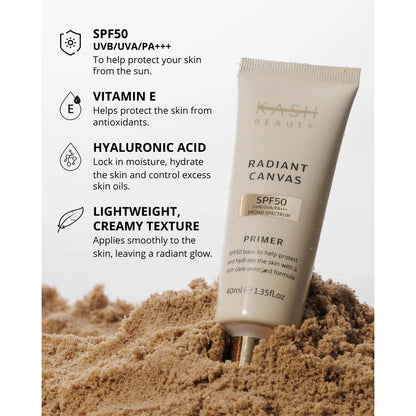 Achieve a flawless makeup finish while protecting your skin with KASH Beauty Radiant Canvas Primer SPF50. This lightweight, creamy primer delivers powerful SPF 50 protection against harmful UV rays to help prevent sun damage and premature ageing, all while prepping your skin for seamless makeup application.