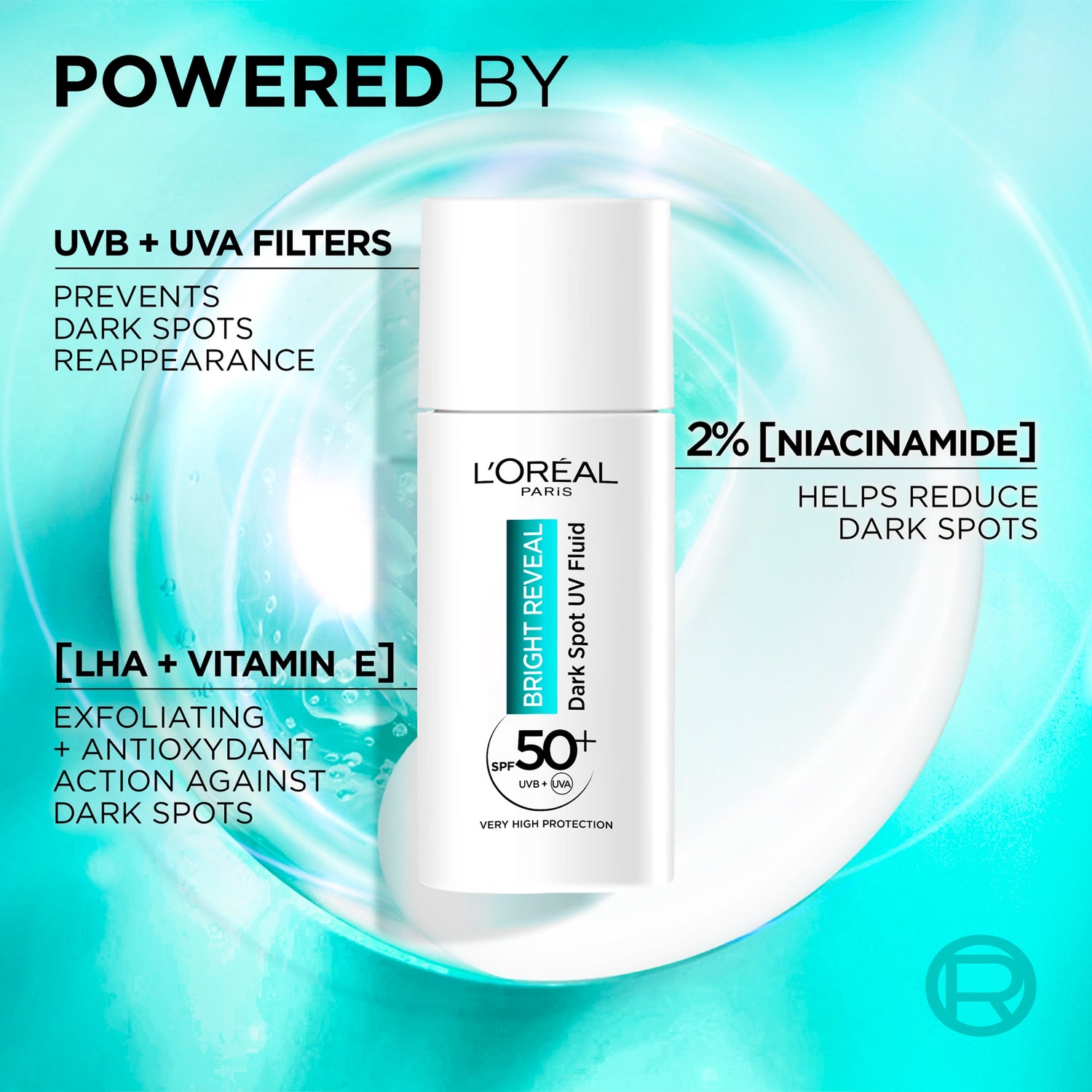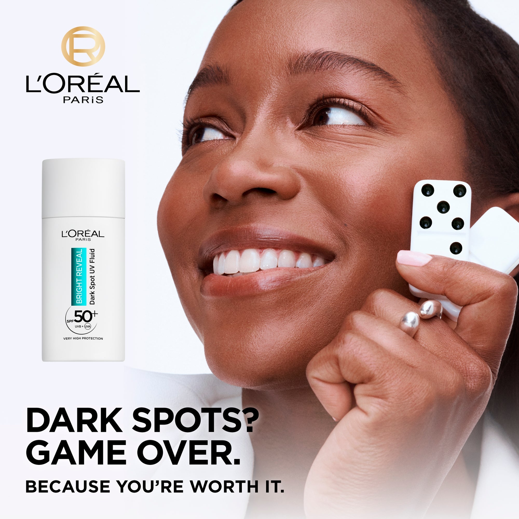 The L'Oréal Paris Bright Reveal Dark Spot UV Fluid SPF 50+ offers daily broad-spectrum protection to reduce the appearance of all types of dark spots including post-breakout marks, hormonal spots, sunspots and age spots.