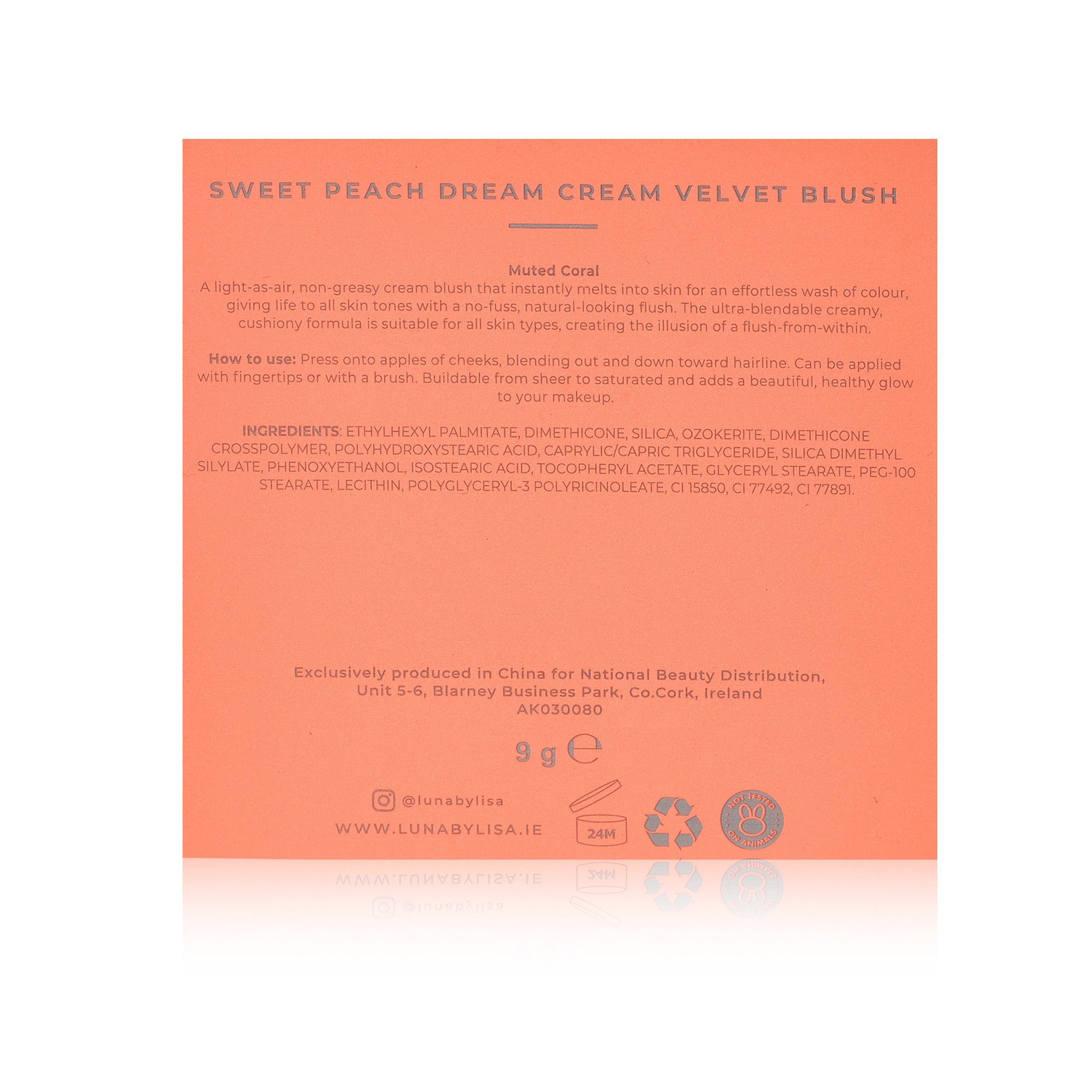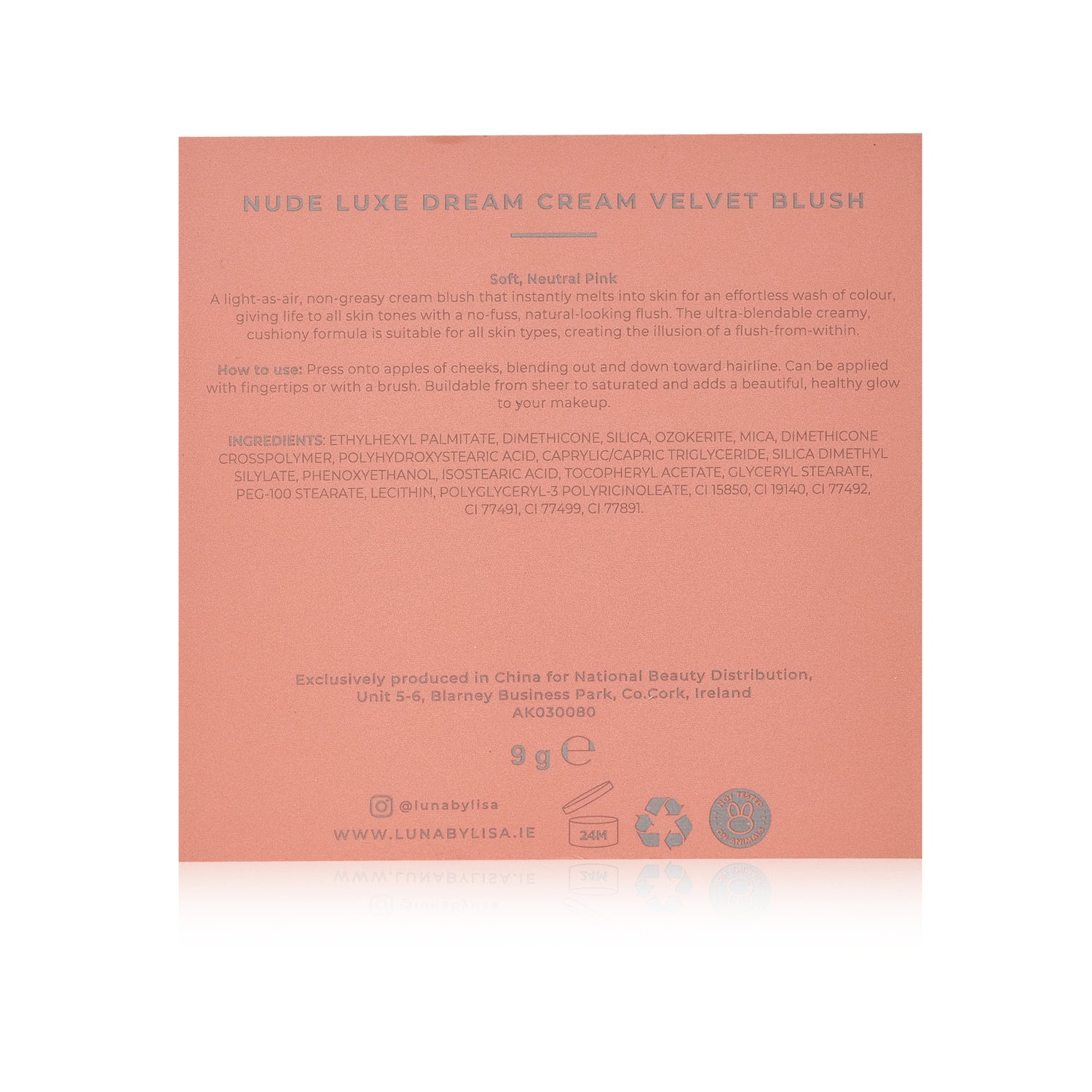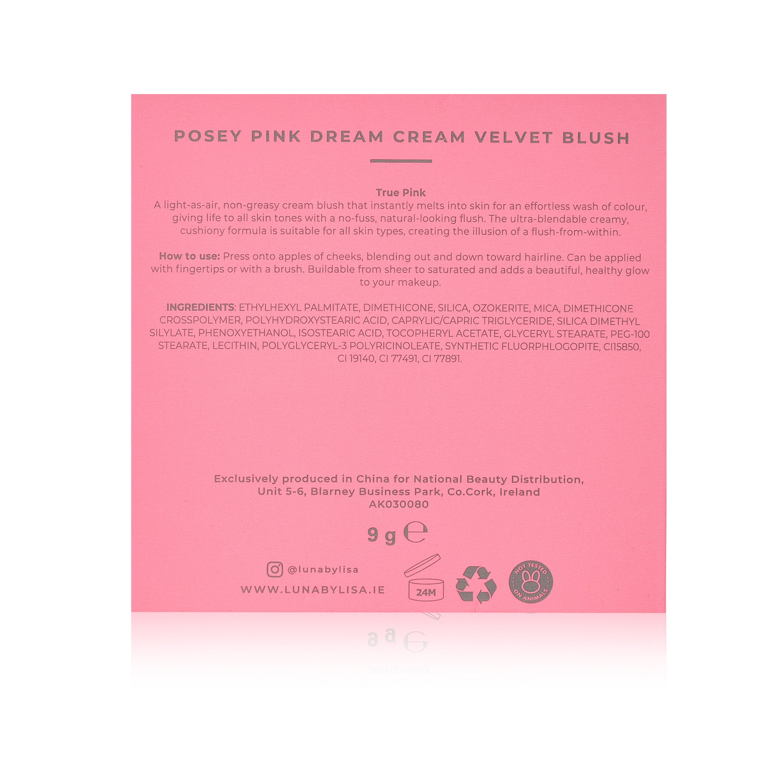Press onto apples of cheeks, blending out and down toward hairline. Can be applied with fingertips or with a brush. Buildable from sheer to saturated and adds a beautiful, healthy glow to your makeup.