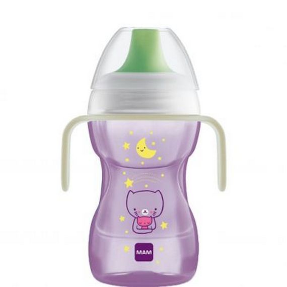 The MAM Fun to Drink 270ml Cup makes learning to drink easy thanks to the extra soft spout with a patented valve system. Thanks to this clever design parents can relax whilst their toddlers learn to drink with either spill-free or free flow. Choose between a non-spill cup or a free-flow cup by simply adding or removing the clear valve; this also allows for easy and complete cleaning. The ergonomic non-slip glow-in-the-dark handles make it easy and comfortable for baby's small hands to hold, with the added benefit of parents having no problem finding the cup at night and disturbing their little one. The Cup comes in Girl or Boy varieties and features cute nighttime motifs, perfect for a pre-bedtime feed. The Fun to Drink can also be reassembled with components of other MAM Cups, with the handles and spout able to be added to other bottles in the MAM range.
