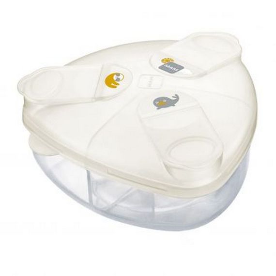 Feeding your baby on the go with formula is now quick and easy thanks to the MAM Milk Powder Box with its unique triangular design allowing easy pouring without mess. Designed to offer parent’s a convenient feeding solution while away from home. The Milk powder box is a sleek and flat design making it a portable, lightweight storage container that safely holds up to three separate 8oz bottle feeds. The spill-proof lid offers three easy to open snap covers for each compartment, while the whole lid can be removed for easy cleaning and filling.