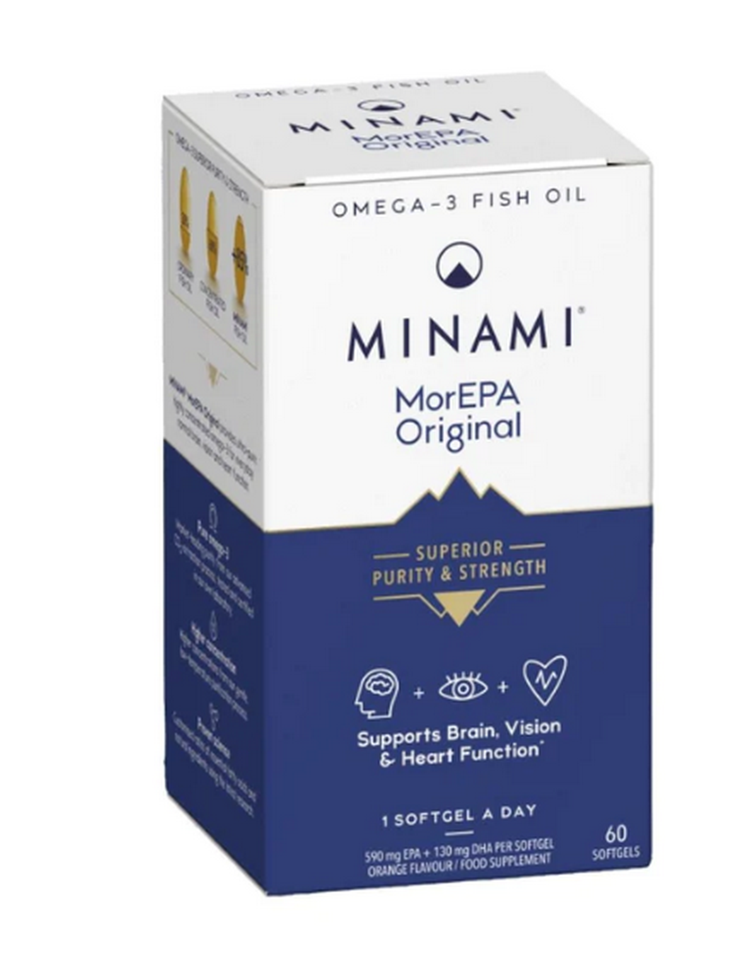 MINAMI MorEPA Original provides ultra-pure, highly concentrated omega-3 for everyday vision, brain and heart health. EPA and DHA, the essential fatty acids found in omega-3, contribute to the normal function of the heart (with 250 mg EPA+DHA daily; 1 softgel/day)1. DHA contributes to the maintenance of normal brain function (with 250mg of DHA daily; 2 softgels/day).