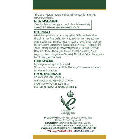 Natures Aid Active Man with Arginine, Damiana, Korean Ginseng and Maca is an advanced formulation to support sexual wellness. Also includes Zinc which contributes to normal fertility and reproduction and to the maintenance of normal testosterone levels in the blood.