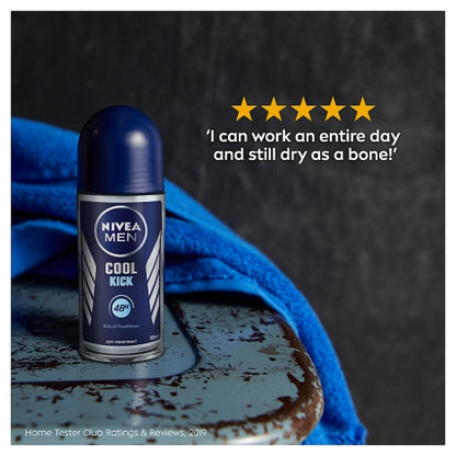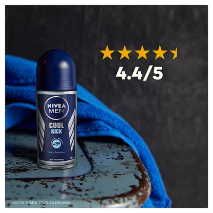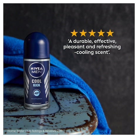 NIVEA MEN Cool Kick Anti-Perspirant Deodorant Roll On - A Cool Kick of freshness strong NIVEA MEN Cool Kick Anti-Perspirant Deodorant gives you an instant feeling of freshness while effectively protecting you from sweat and body odour for 48 hours. The formula with Cool-Care will leave you feeling fresh while protecting and caring for your skin no matter what your day has in store and provides dry freshness to keep you feeling clean for the rest of the day. The men's deodorant roll on is skin tolerance dermatologically approved and is completely alcohol-free.
