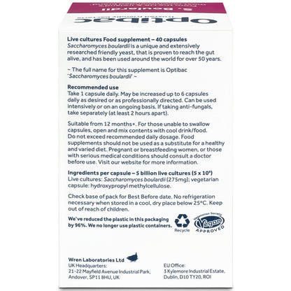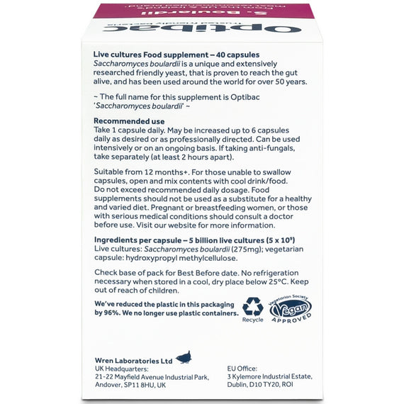 Pure Saccharomyces boulardii supplement: Optibac Saccharomyces boulardii contains 5 billion live cultures of pure S. boulardii, guaranteed until end of expiry