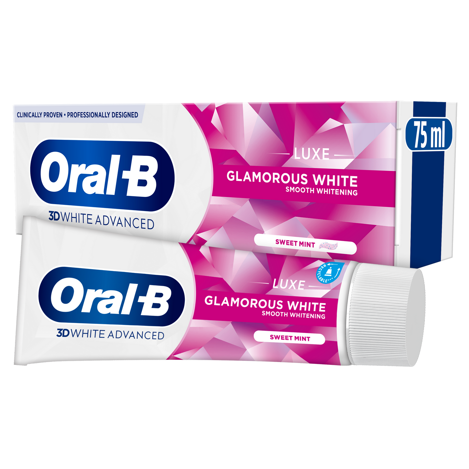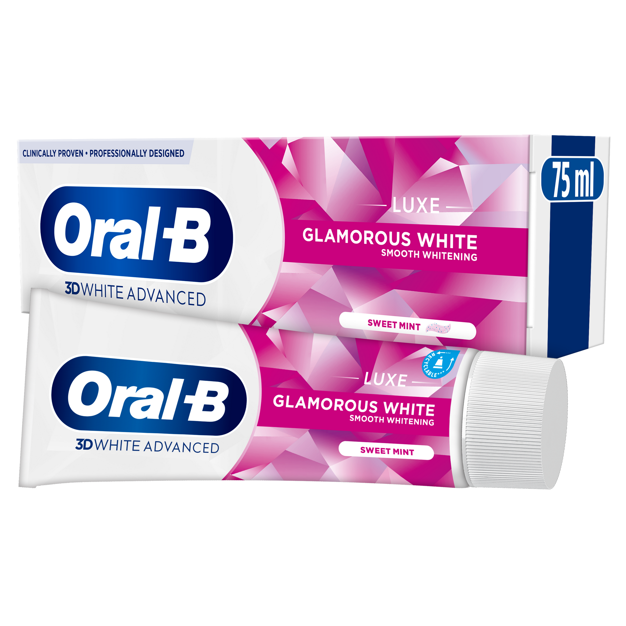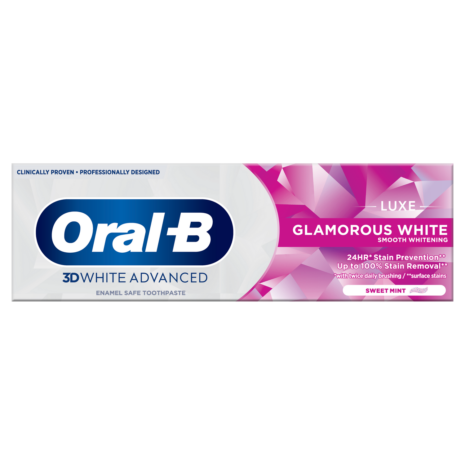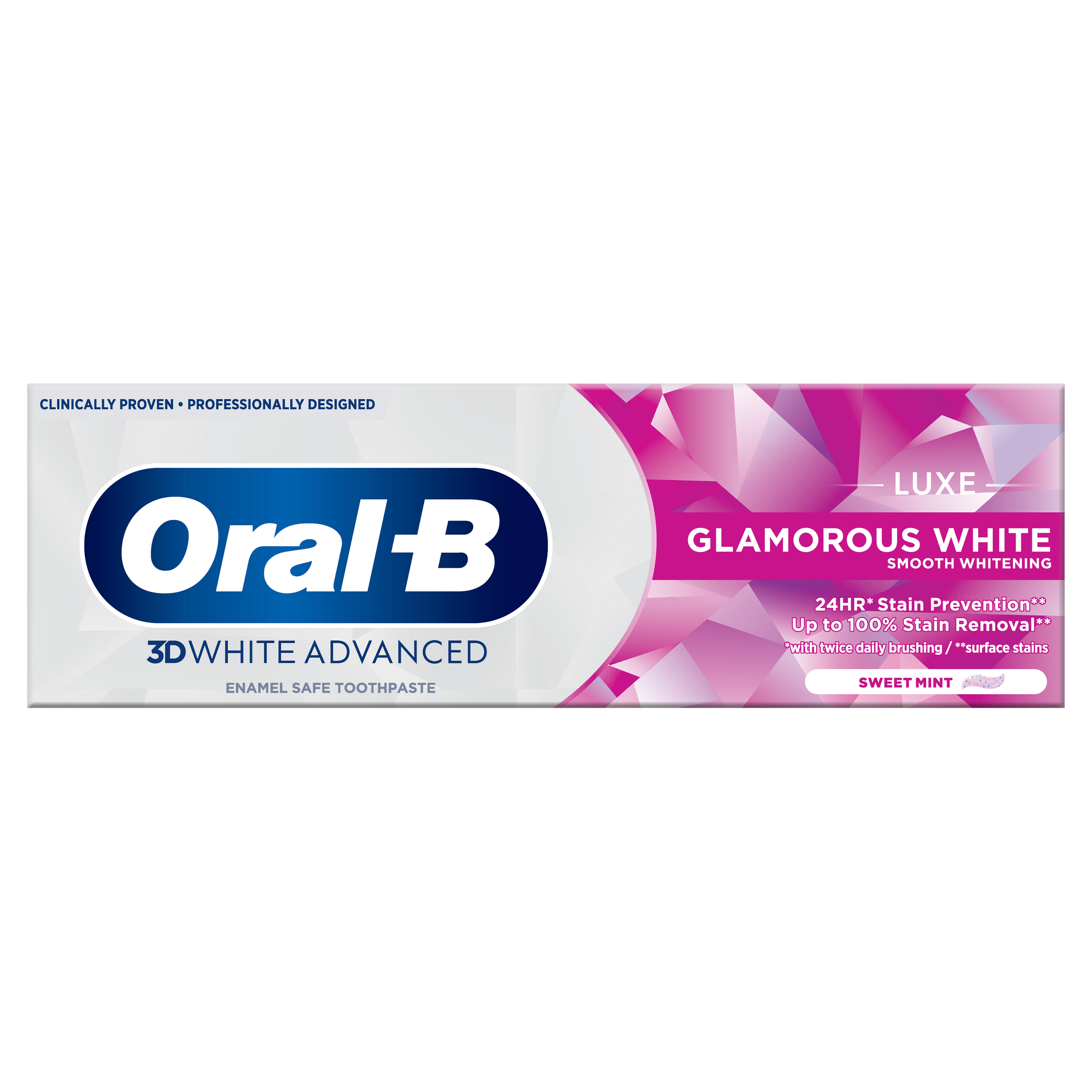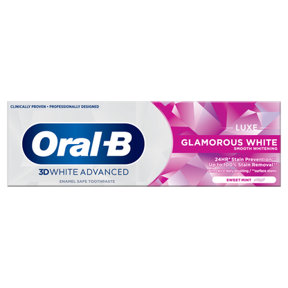 The revitalizing formula of Oral-B 3DWhite Luxe Glamorous White toothpaste actively protects against surface stains for 24 hours with twice daily brushing. Its deep penetrating foam actively removes up to 100% of surface stains in hard to reach areas and its nourishing fluoride strengthens enamel.