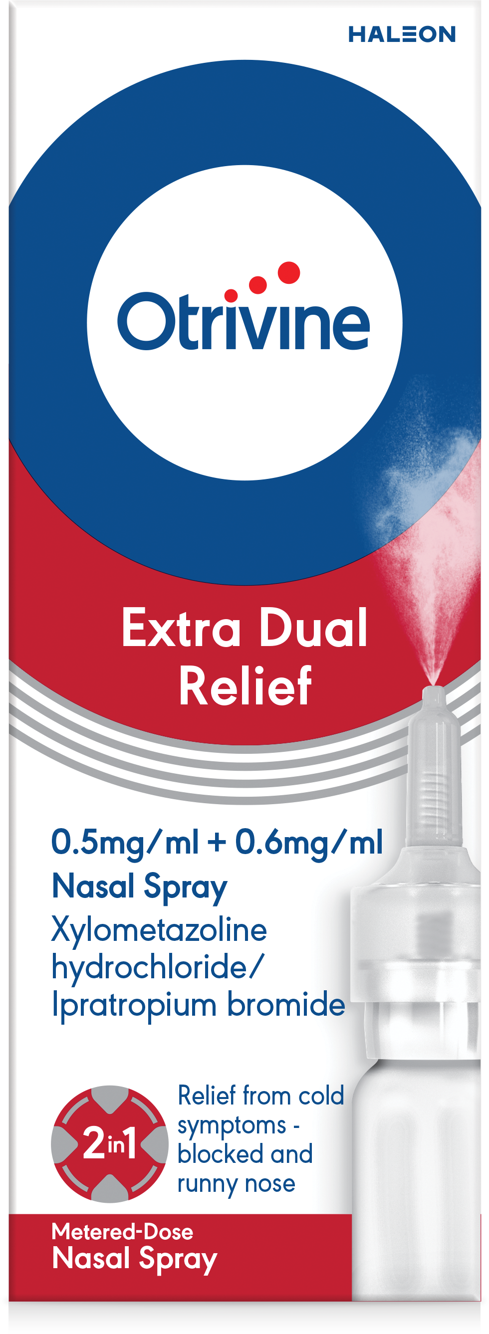 Otrivine Extra Dual Relief Nasal Spray treats nasal congestion with runny nose (rhinorrhea) caused by common colds that gets to work in just 5-15 minutes and lasts for 6-8 hours. It contains 2 active ingredients to treat nasal congestion, runny nose, sinus pressure and sneezing simultaneously in adults over 18 years.