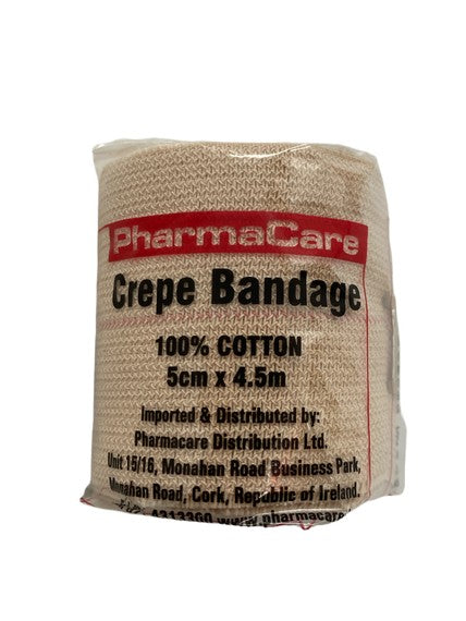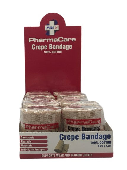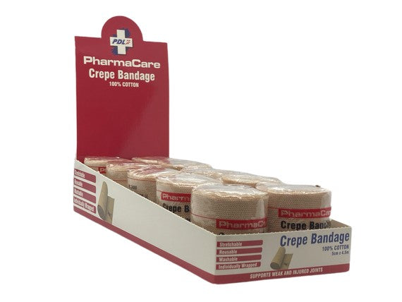 The PharmaCare Crepe Bandage is a strong compression bandage for weak or injured joints. It is made of 100% cotton yarn that provides constant elasticity, while also being reusable and washable. The crepe bandages are individually wrapped. The PharmaCare Crepe Bandages can be used to support weak and injured joints.