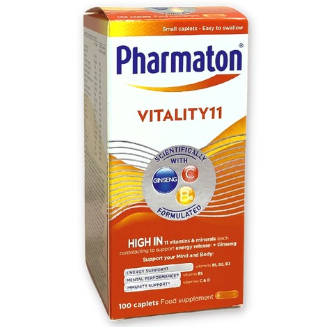 Pharmaton Vitality 11 Caplets are scientifically formulated with, and high in 11 Vitamins & Minerals that each contribute to normal energy yielding metabolism + Ginsneg G115.