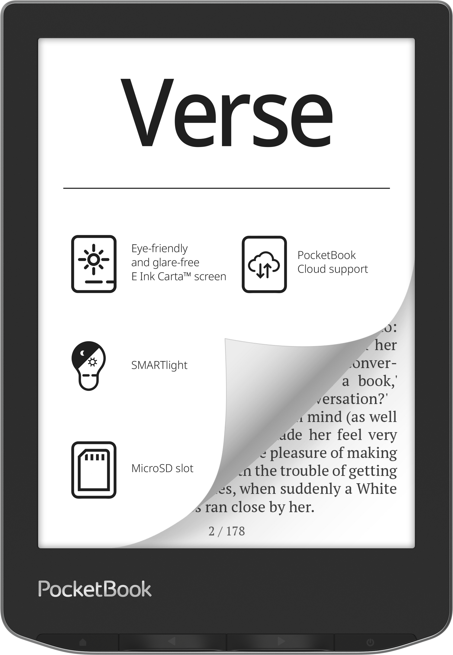 An exceptionally user-friendly, compact, and lightweight 6-inch PocketBook Verse e-reader, aimed to give all needed for comfortable reading. PocketBook Verse features an eye-friendly E Ink Carta touchscreen and adaptive SMARTlight, has a microSD slot, and supports PocketBook Cloud.