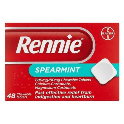 Rennie Spearmint is an antacid tablet that neutralises excess stomach acid to relieve the symptoms of heartburn and indigestion, with a fresh mint flavour.