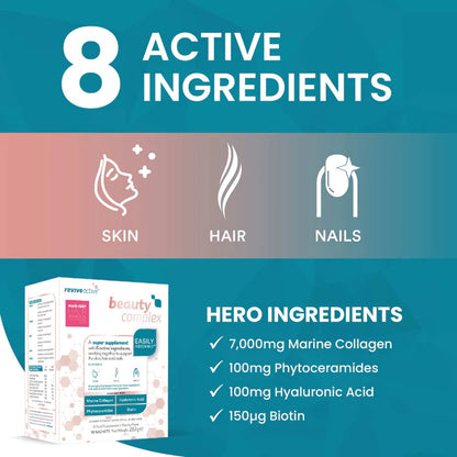 With a unique blend of ingredients including Marine Collagen, Hyaluronic Acid, Phytoceramides, Biotin , Beauty Complex encompasses all the essentials for achieving gorgeous hair, skin and nails.