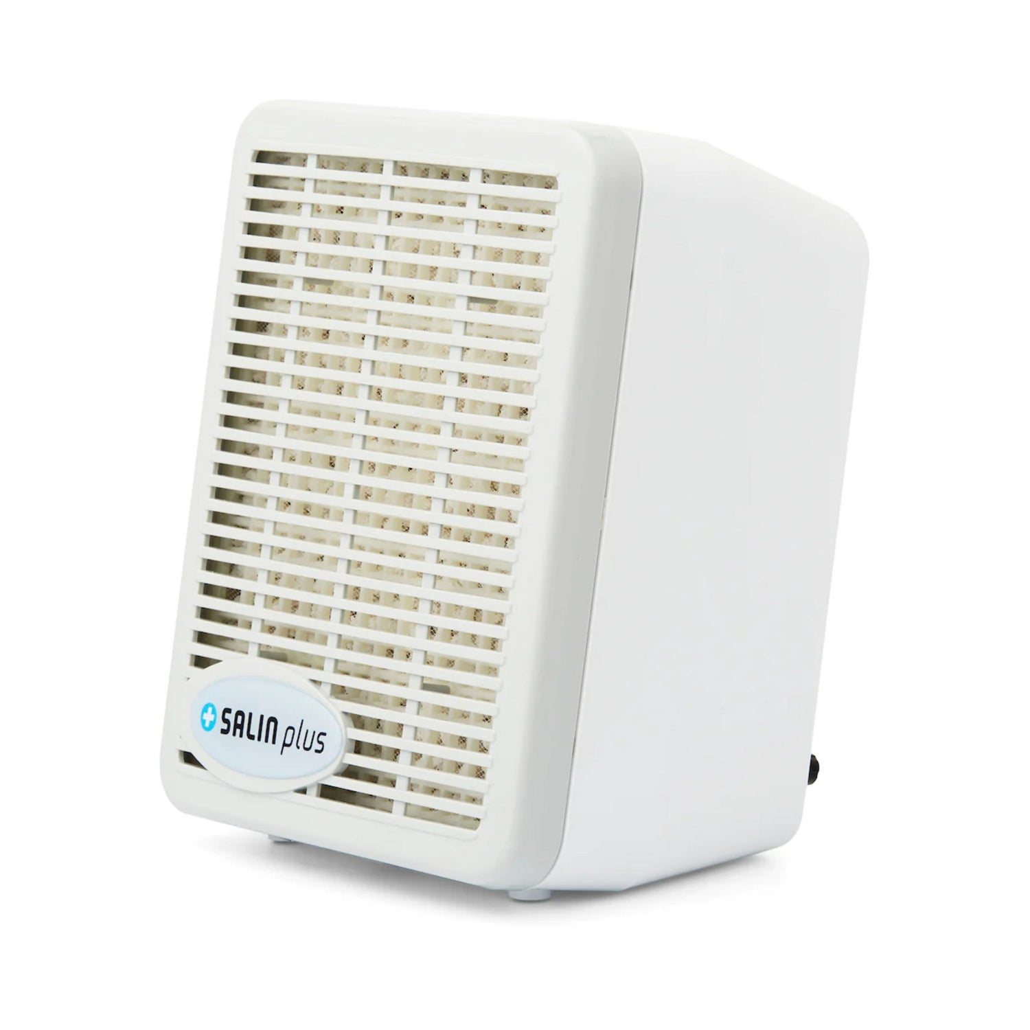 - Salin Plus uses a fan to draw in air, pass it through a salt cartridge, and release purified air back into the room. The cartridge contains 98% Sodium Chloride (NaCl), along with Calcium Chloride and Magnesium, producing a fine mist that helps change the ionization of the air, making it easier to breathe.