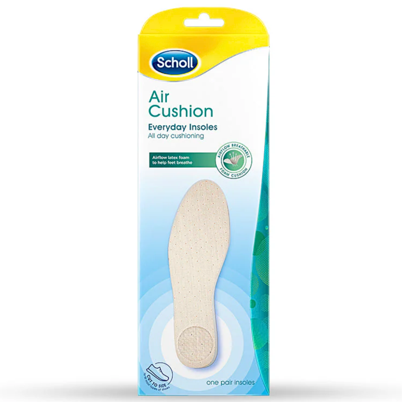 Soft airflow latex foam insoles designed for all day comfort and cushioning. The soft latex foam in Scholl's Air Cushion Insoles helps to provide additional comfort by cushioning the impact when your foot hits the ground. Can be individually trimmed to fit every size shoe. These insoles are perforated to allow your feet to breathe and moisture to escape.