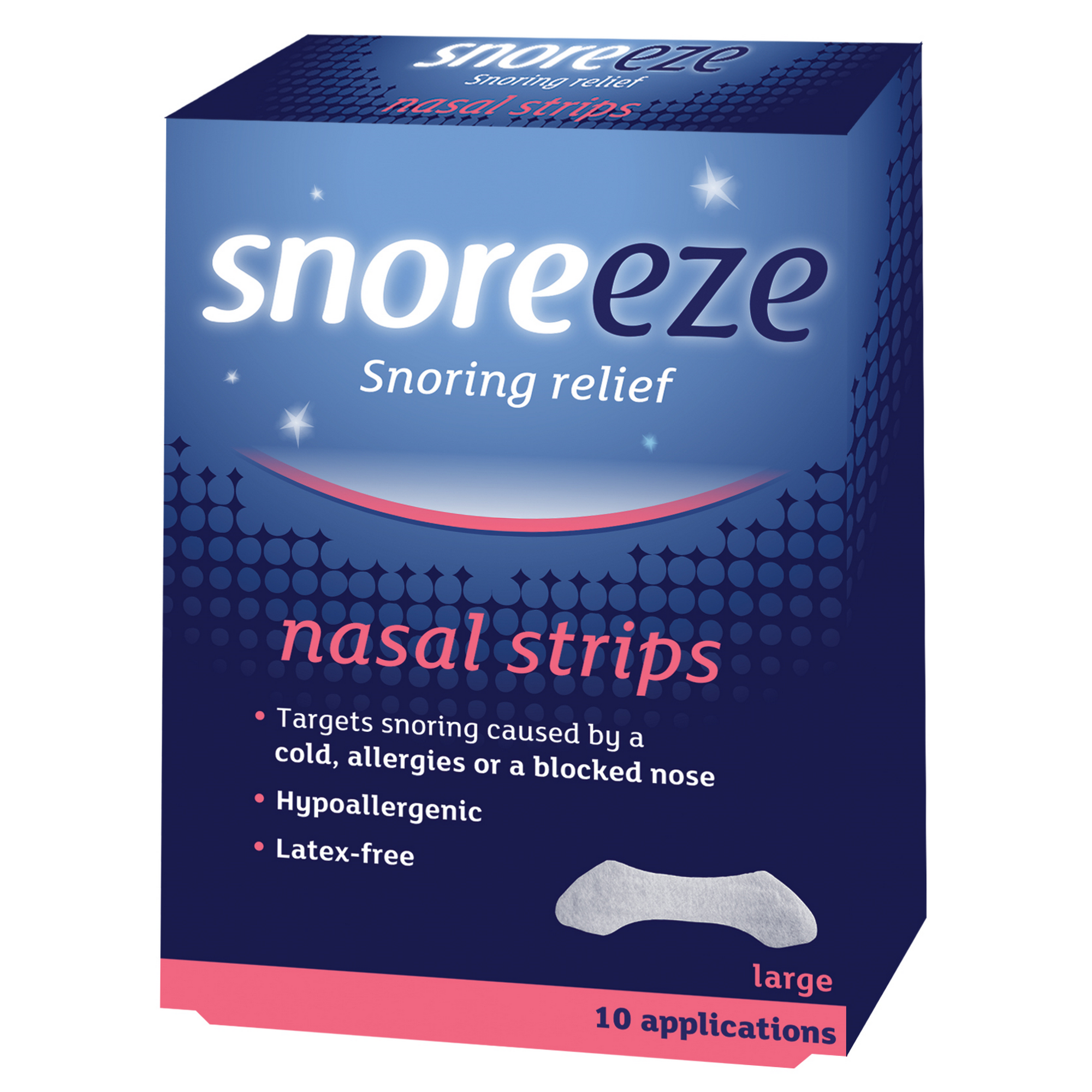 Snoreeze Nasal Strips target snoring caused by a cold, allergies or a blocked nose. Their flexible bands gently open the airways and improve airflow to provide effective snoring relief for up to 8 hours.