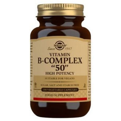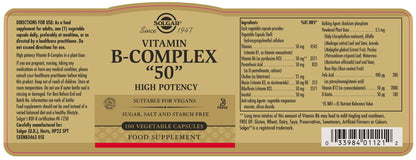 Solgar B-Complex "50" Vegetable Capsules have been specially formulated for the metabolism of carbohydrates, fats and proteins, which convert food into energy. These vegetable capsules are free from Gluten, Wheat, Dairy, Soy, Yeast, Sugar, Sodium, Artificial Flavor, Sweetener, Preservatives and Color.