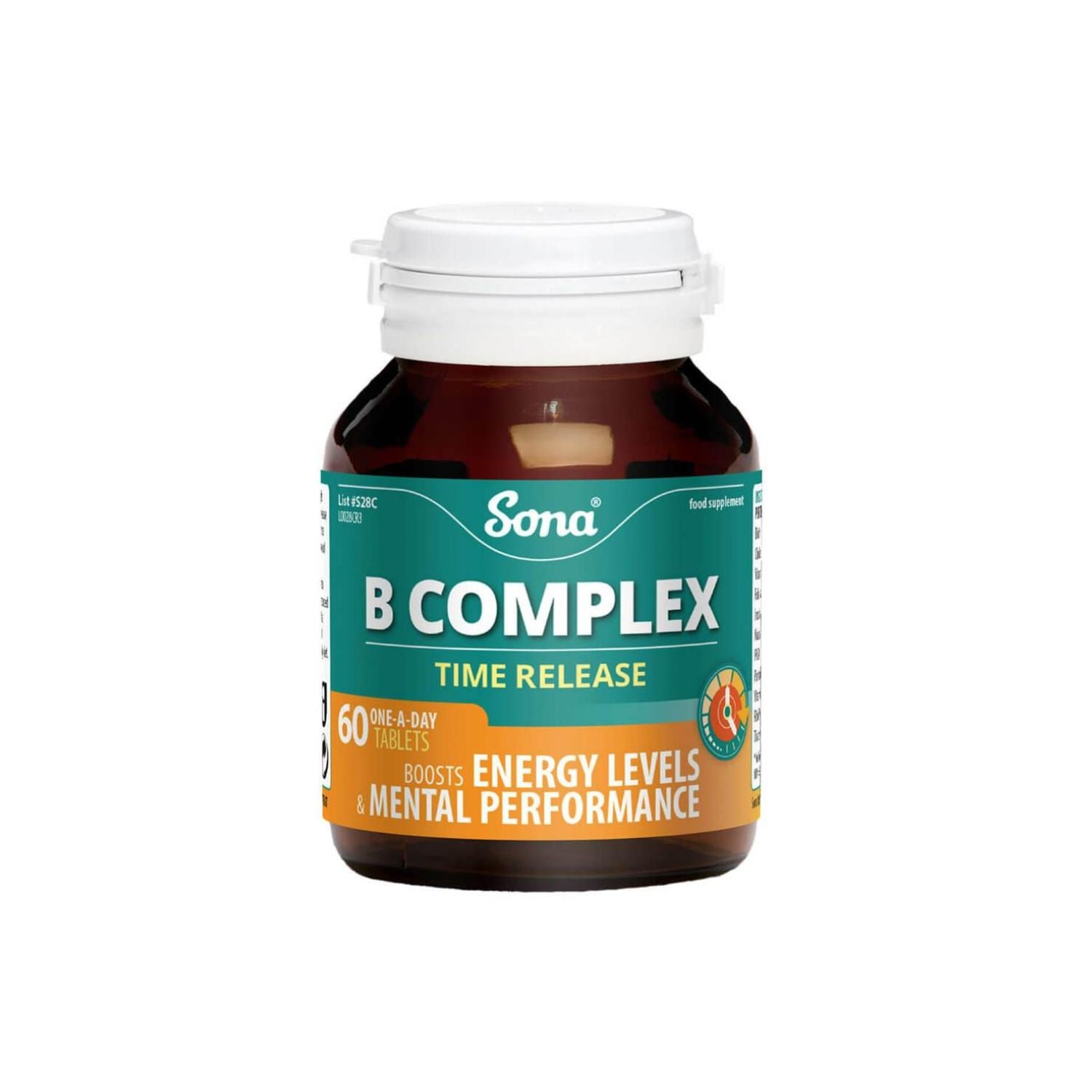 Sona B Complex is a carefully balanced formula providing 11 essential B vitamins in a convenient one-a-day, time-release tablet. Designed for gradual absorption throughout the day, this supplement supports energy metabolism, mental performance, stress reduction, and the healthy function of the immune and nervous systems.