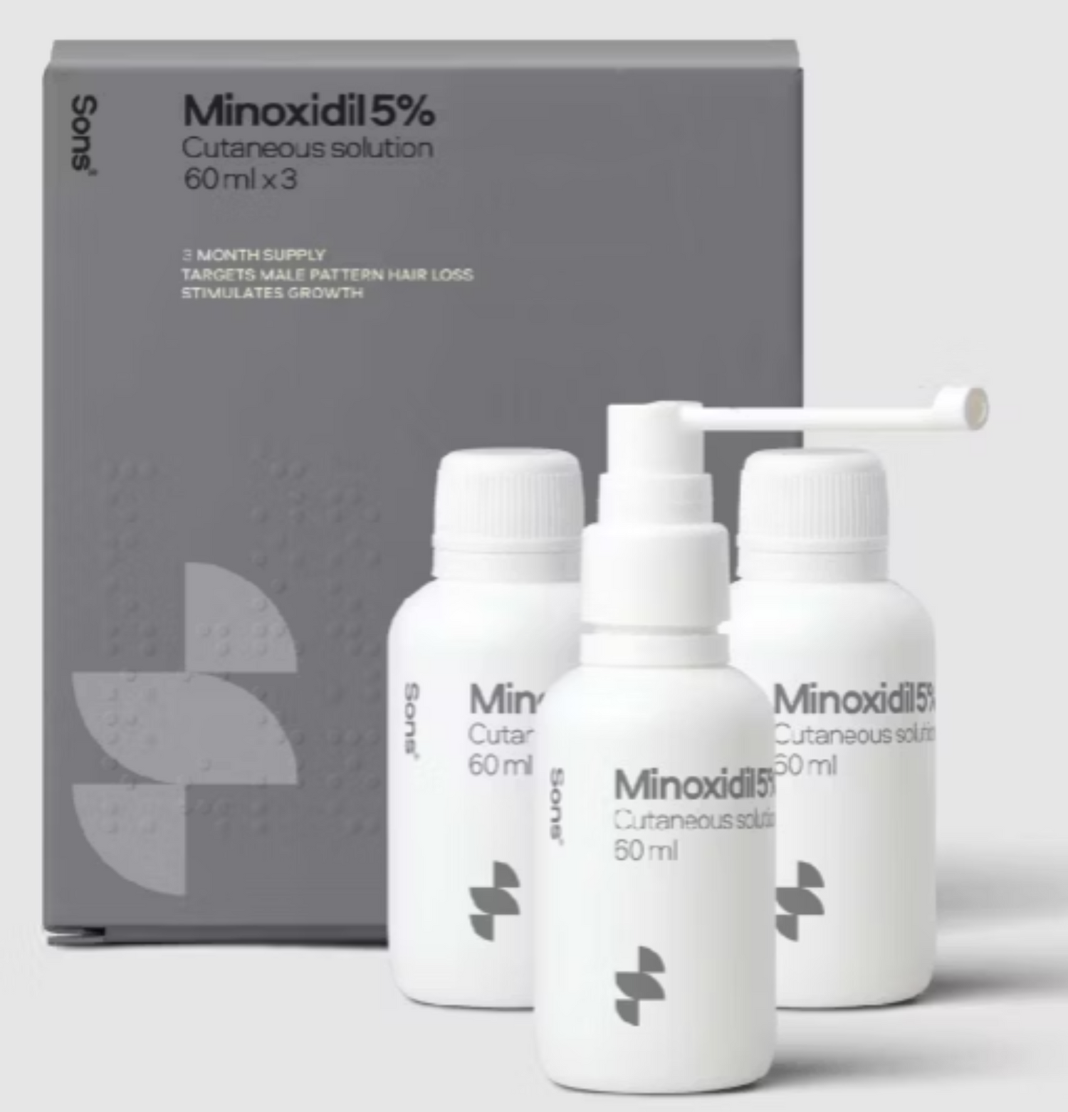 Minoxidil is a topical solution to increase blood flow and Oxygen to the scalp which helps to reactivate shrunken follicles. Each ml of solution contains 50mg of minoxidil. Also contains Ethanol 96%, propylene glycol and purified water. For the treatment of moderate male-pattern hair loss in males aged 18-65 years. With easy nozzle application, Sons Minoxidil Solution can start to work within 3 months.