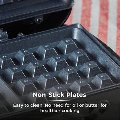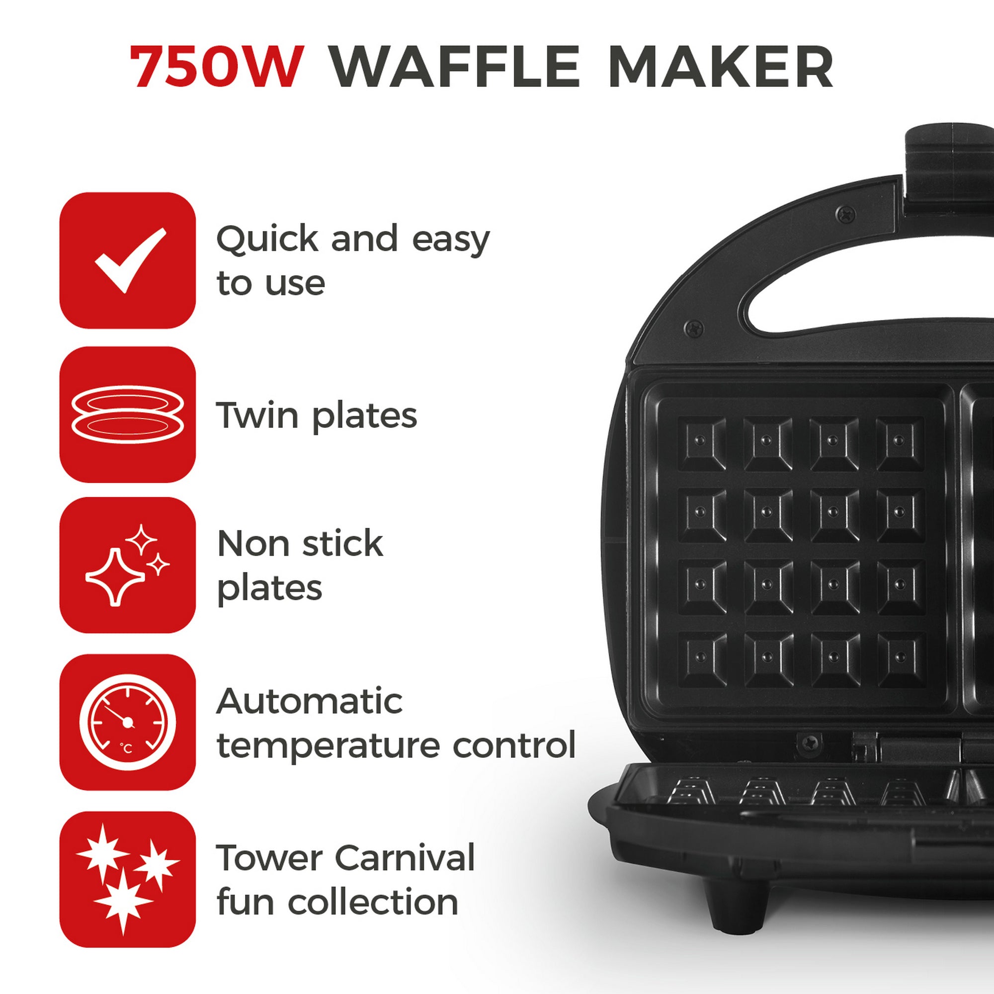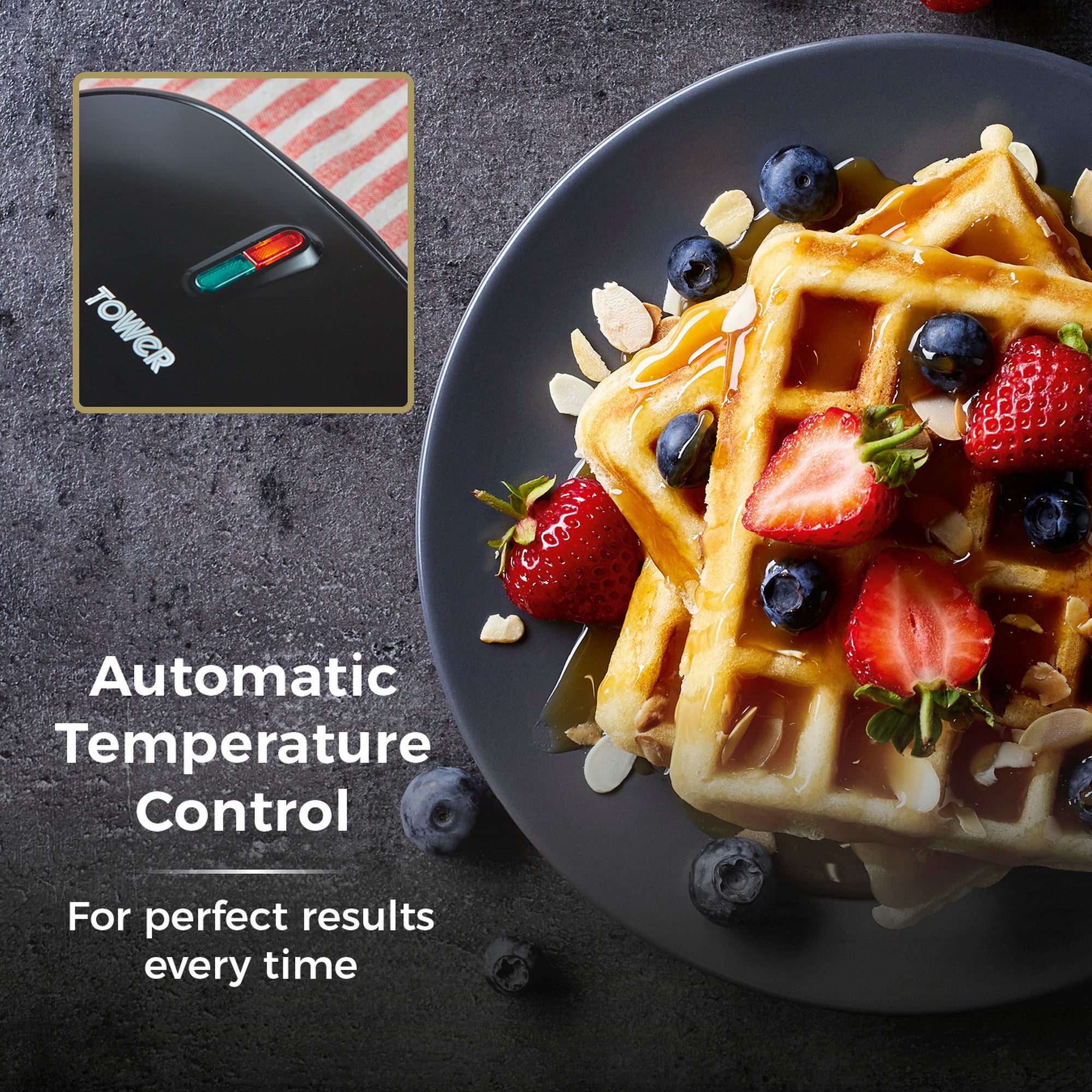Smart indicator lights guide you through the cooking process, while the non-stick cooking plates allow for easy release without oil or butter – making clean-up quick and hassle-free. Designed with cool-touch handles and a lockable latch for added safety, this stylish waffle maker is part of the Tower Party Fun Collection – perfect for gifting or adding some fun to your kitchen.