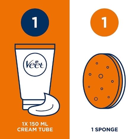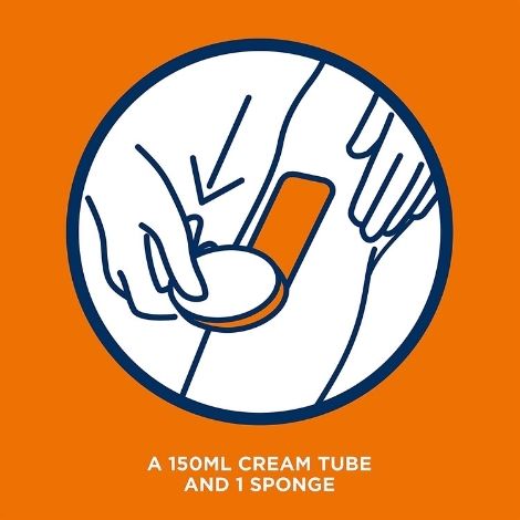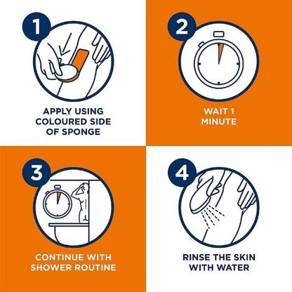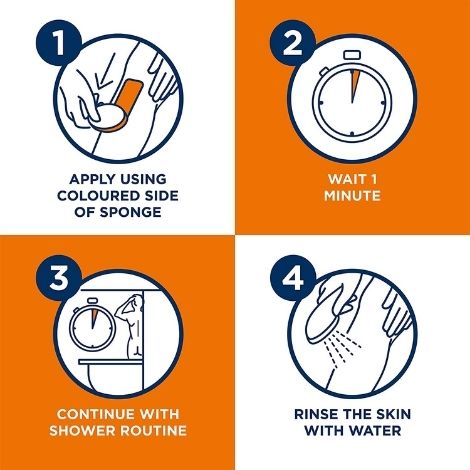 1. Before you shower, use the soft, coloured side of the sponge to apply the cream evenly onto dry skin. Don't rub it in. Make sure the hair you want to remove is completely covered.