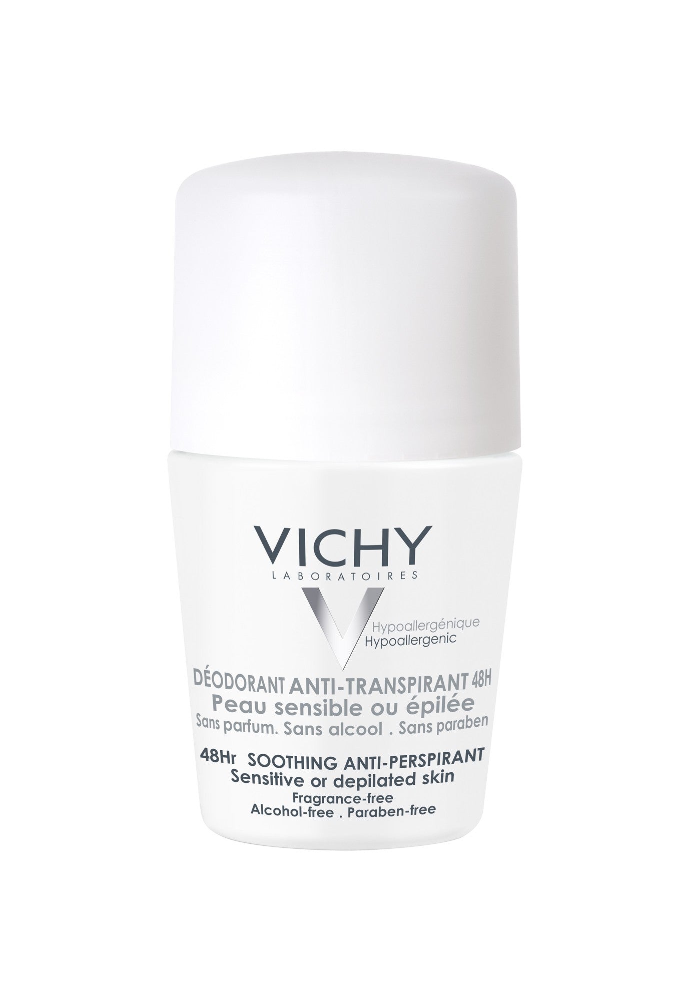 Reinforce skin with the Vichy 48hr Soothing Anti-Perspirant Roll-On; a breakthrough formula that keeps skin fresh and dry. This lightweight antiperspirant continuously regulates perspiration for 48 hours, offering effective protection without blocking the pores or irritating the skin. Proline Cutei, a soothing, anti-irritating, organic amino complex quickly relieves irritation. The skin is left looking soft and smooth, with a supple and healthy feel. Apply a thin layer to clean, dry skin. Hypoallergenic.