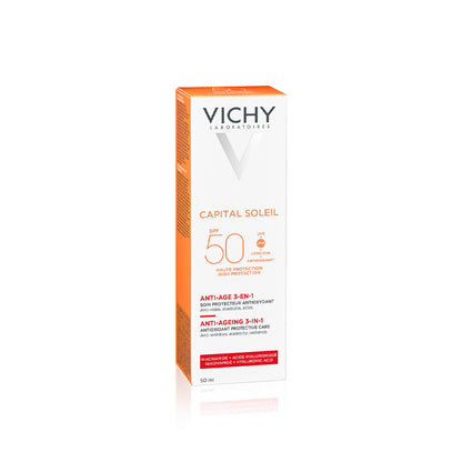 Protect your skin against the ageing effects of the sun with the Vichy Capital Soleil Anti-Ageing 3-in-1 Antioxidant SPF50. Specifically formulated for mature skin, the anti-ageing SPF50 is enriched with black tea, Vitamin E and Vichy Volcanic Water. The formula helps target the appearance of ageing, including fine lines and lack of firmness, whilst providing very high broad-spectrum SPF50 to counteract future ageing signs caused by UV exposure. KEY INGREDIENTS: Vitamin E + Volcanic Mineralizing Water + Black Tea.