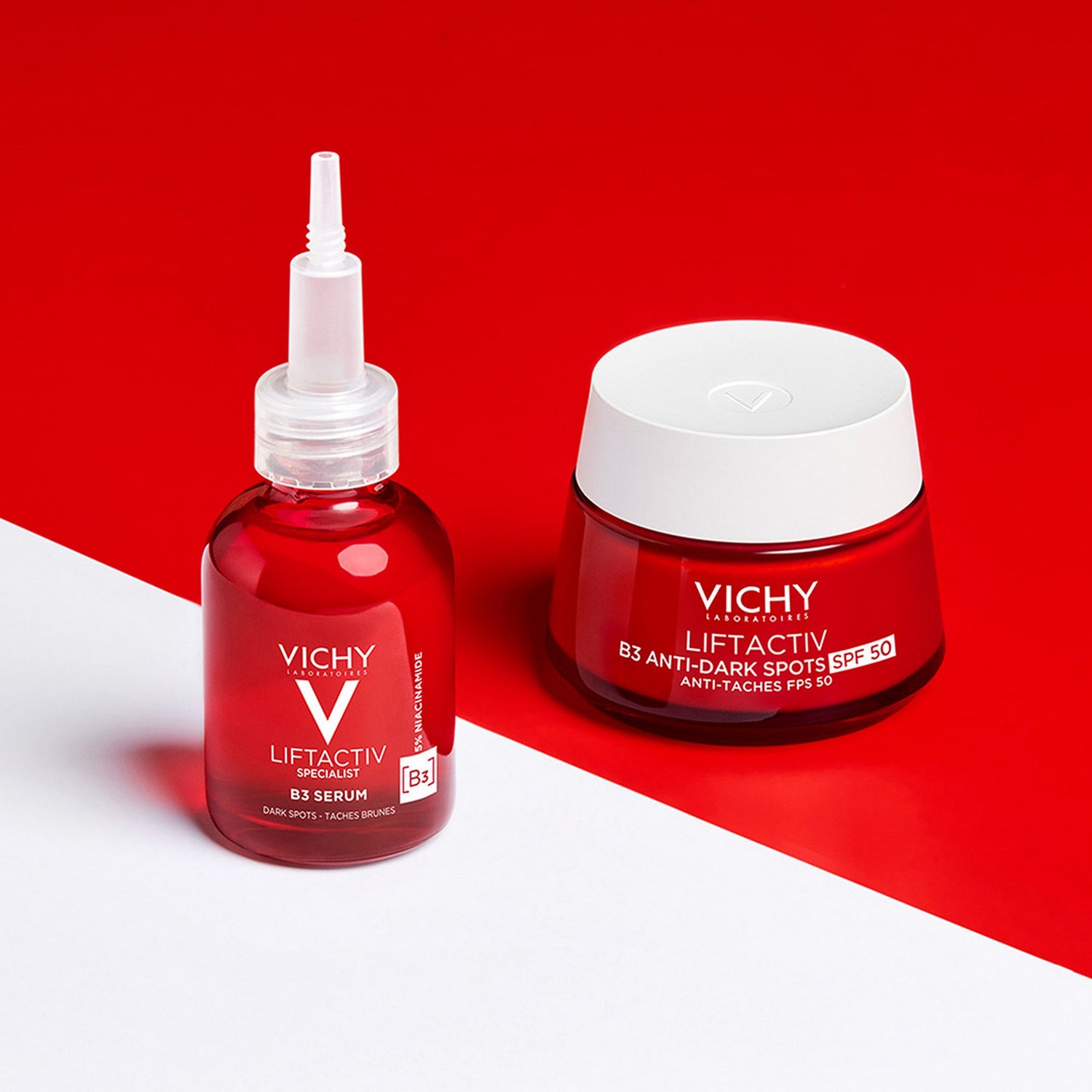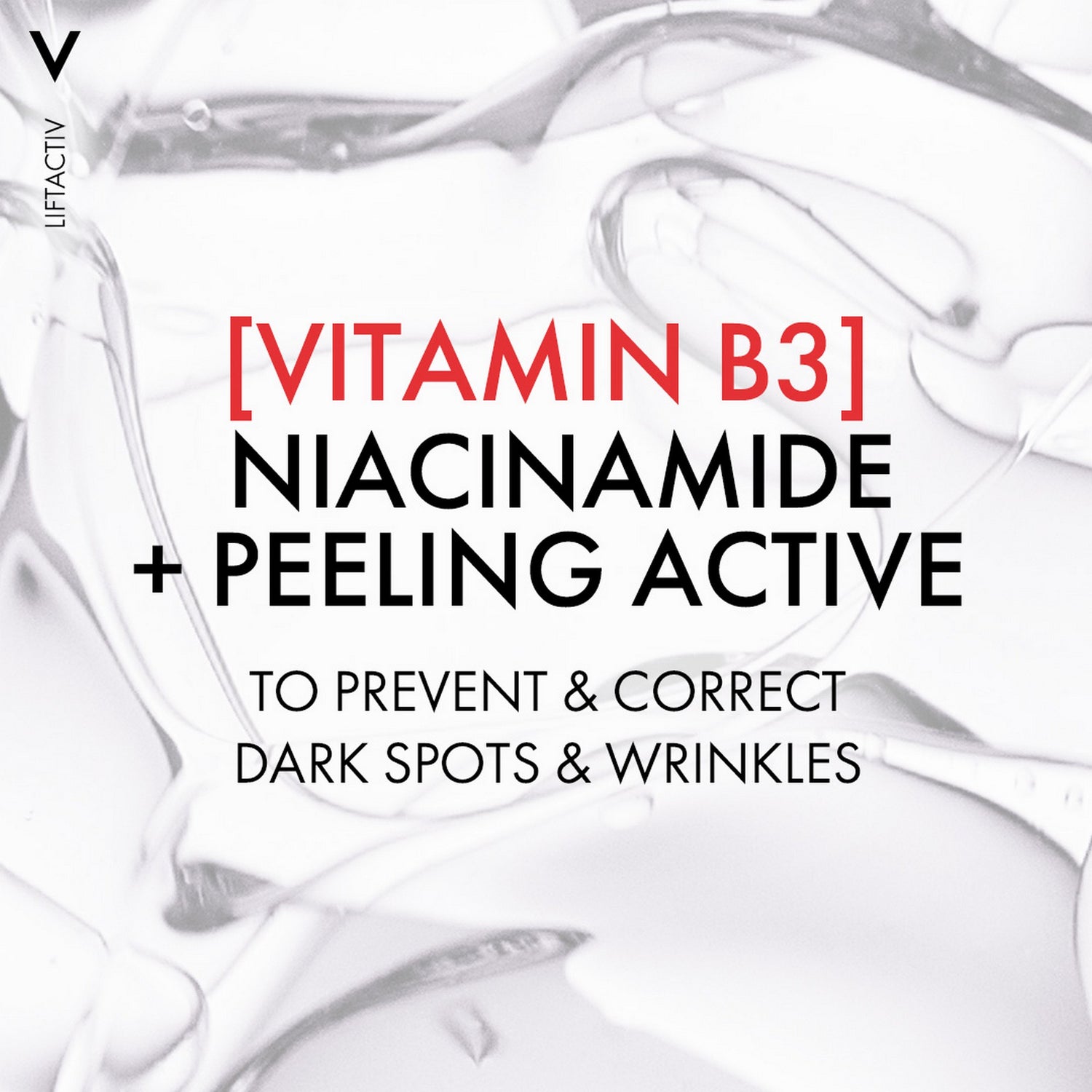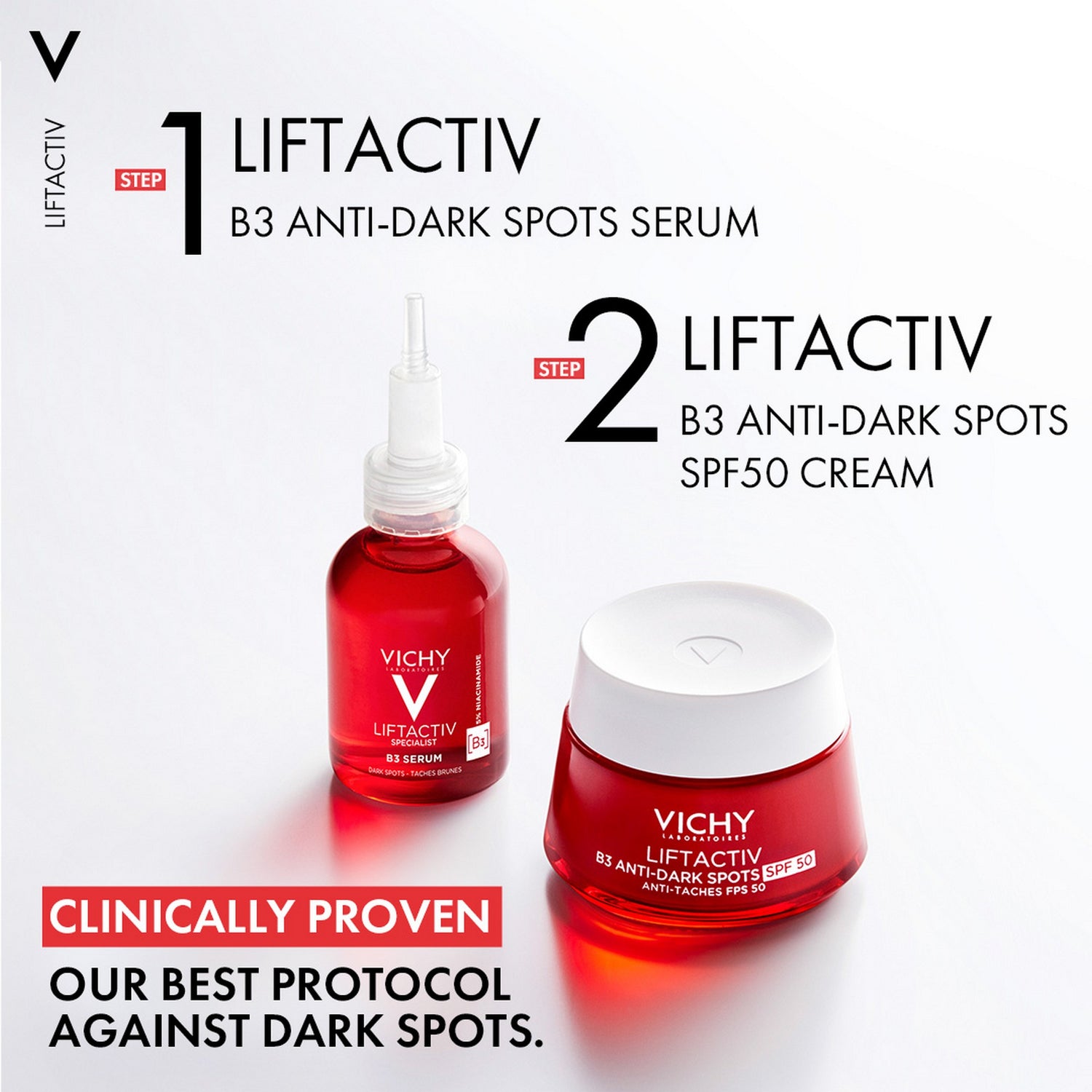 Liftactiv Niacinamide B3 Anti-Dark Spots and Pigmentation Cream SPF50 helps to correct and reduce pigmentation and appearance of wrinkles. Formulated with multipurpose hero dermatological active Niacinamide (Vitamin B3) and skin-surfacing peeling active LHA. The formula helps to reduce the appearance existing dark spots combined with ultra high broad-spectrum SPF50 to help prevention of pigmentation induced by UV-damage. 48 hour long-lasting hydration and creamy velvet texture.