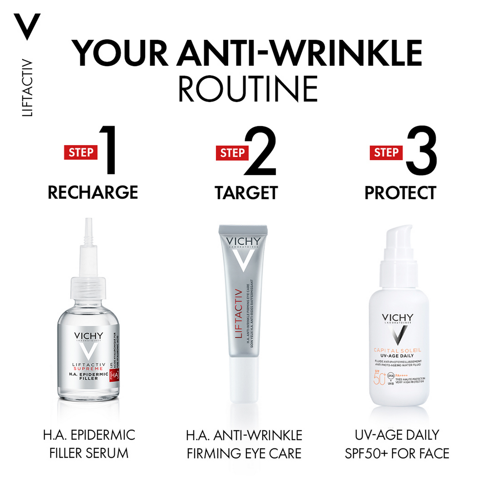 Use Vichy Liftactiv H.A. Anti-Wrinkle Firming Eye Cream daily around eye contour evening and night. Use a pea size amount of product and apply delicately using clean fingertips around the eye area. Complete your Anti-Wrinkle Firming routine with Liftactiv Supreme Day and Night Creams.