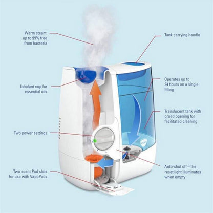 The Vicks VH845E1 Warm Mist Humidifier is designed to provide comfort and relief for both children and adults. By releasing up to 99% bacteria-free mist into the air, this humidifier helps promote easy breathing and a more restful sleep. It features a large 3.8L tank that provides up to 24 hours of continuous use per filling, ensuring uninterrupted comfort throughout the night. With two adjustable mist settings, you can control the humidity level based on room size and air dryness. Compatible with VapoPads scented pads infused with essential oils, it allows for added soothing vapors to enhance relaxation and respiratory relief. Recommended for rooms up to 55m².