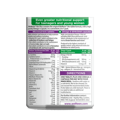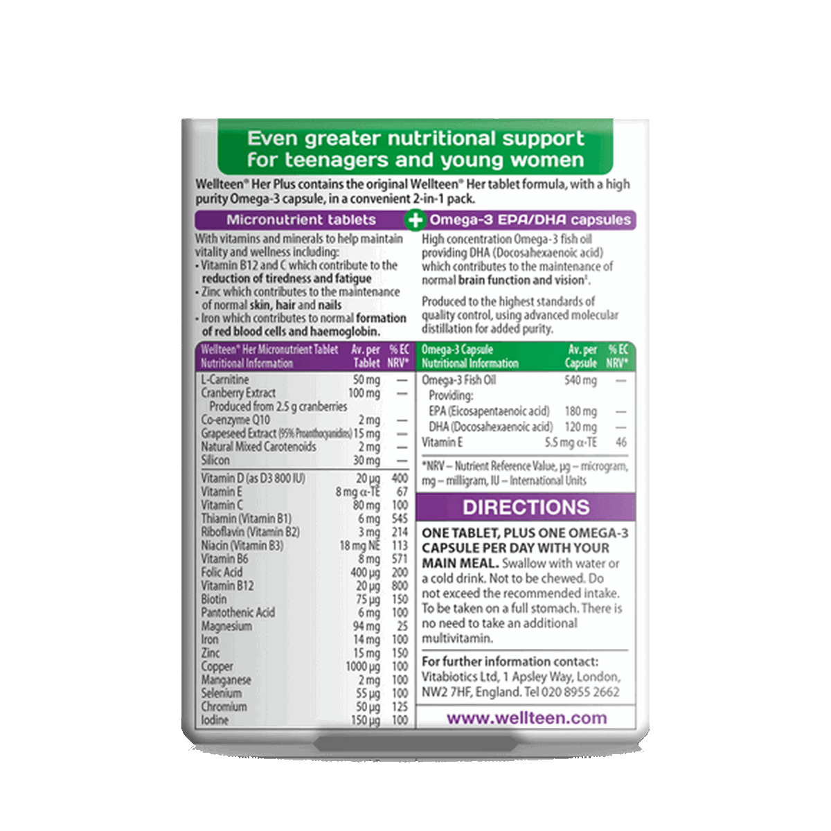 Vitabiotics Wellteen Her Plus provides the original Wellteen Her comprehensive range of vitamins, minerals, Co-Q10, L-Carnitine, Grapeseed and Cranberry botanical extracts plus a high purity Omega-3 capsule.
